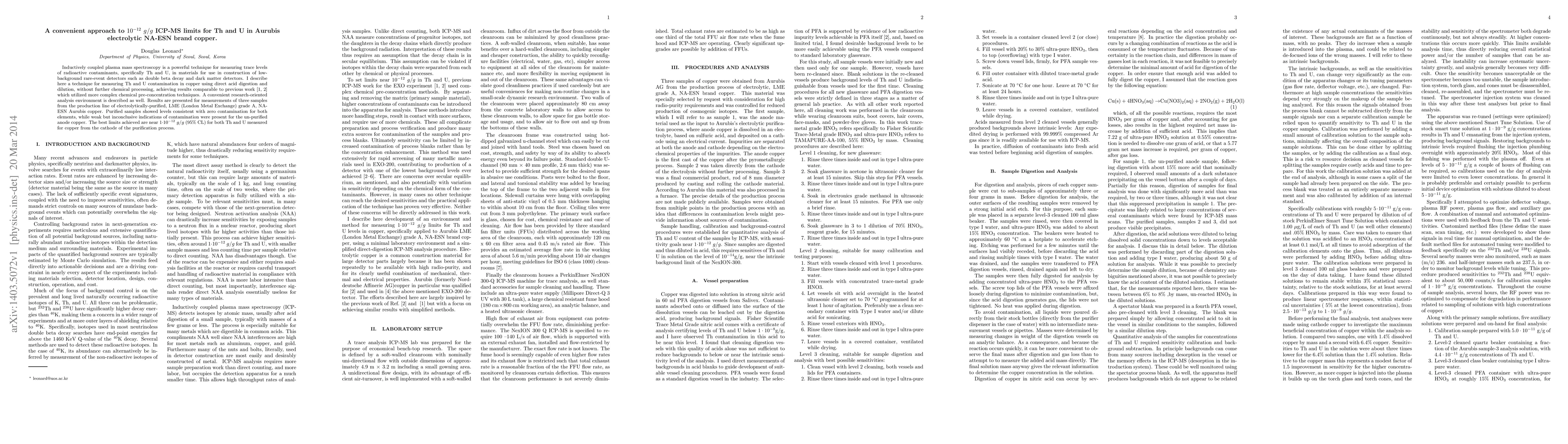 Inductively coupled plasma mass spectroscopy is a powerful technique for measuring trace levels of radioactive contaminants, specifically Th and U, in materials for use in construction of low-background rare-event detectors such as double beta decay and dark matter detectors. I describe here a technique for measuring Th and U contamination in copper using direct acid digestion and dilution, without further chemical processing, achieving results comparable to previous work which utilized more complex chemical pre-concentration techniques. A convenient research-oriented analysis environment is described as well. Results are presented for measurements of three samples from the production line of electrolytically-purified, LME (London Metal Exchange) grade A, NA-ESN Aurubis copper. Purified samples showed levels consistent with zero contamination for both elements, while weak but inconclusive indications of contamination were present for the un-purified anode copper. The best limits achieved are near $1\cdot 10^{-12}$~g/g (95% CL) for both Th and U measured for copper from the cathode of the purification process.