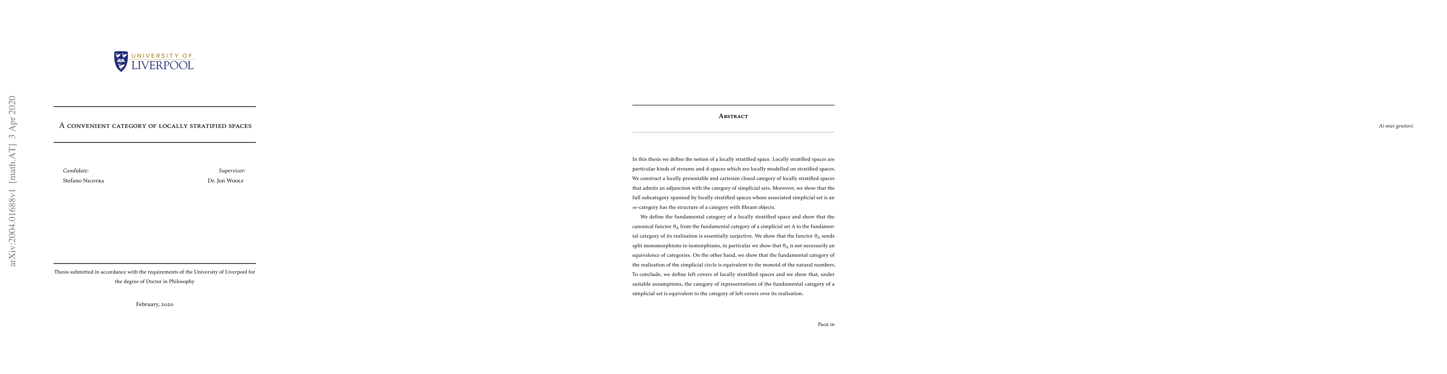 In this thesis we define the notion of a locally stratified space. Locally stratified spaces are particular kinds of streams and d-spaces which are locally modelled on stratified spaces. We construct a locally presentable and cartesian closed category of locally stratified spaces that admits an adjunction with the category of simplicial sets. Moreover, we show that the full subcategory spanned by locally stratified spaces whose associated simplicial set is a quasicategory has the structure of a category with fibrant objects. We define the fundamental category of a locally stratified space and show that the canonical functor from the fundamental category of a simplicial set to the fundamental category of its realisation is essentially surjective. We show that such a functor sends split monomorphisms to isomorphisms, in particular we show that it is not necessarily an equivalence of categories. On the other hand, we show that the fundamental category of the realisation of the simplicial circle is equivalent to the monoid of the natural numbers. To conclude, we define left covers of locally stratified spaces and we show that, under suitable assumptions, the category of representations of the fundamental category of a simplicial set is equivalent to the category of left covers over its realisation.
