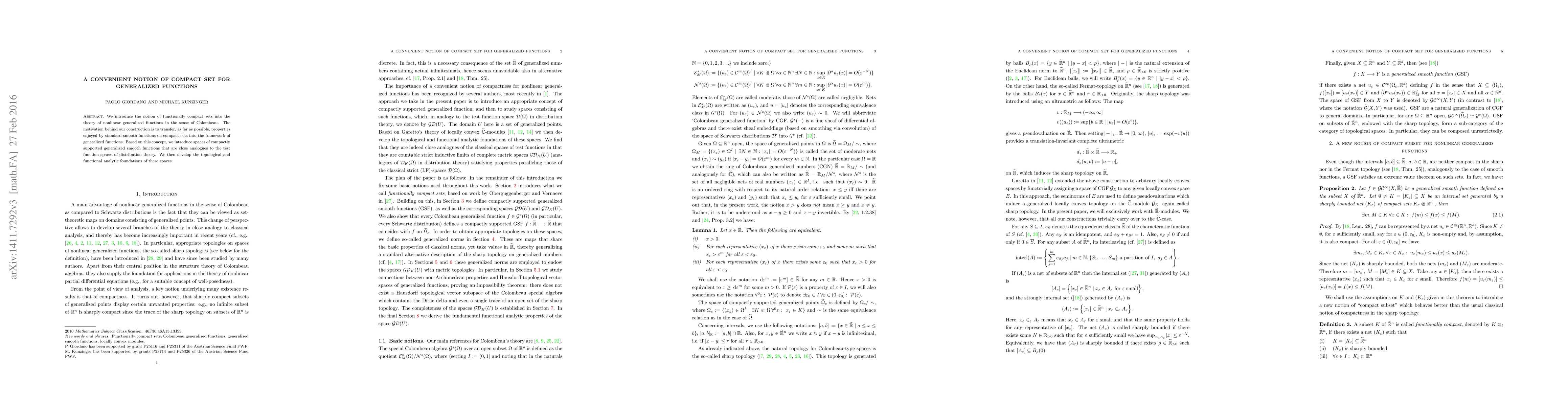 We introduce the notion of functionally compact sets into the theory of nonlinear generalized functions in the sense of Colombeau. The motivation behind our construction is to transfer, as far as possible, properties enjoyed by standard smooth functions on compact sets into the framework of generalized functions. Based on this concept, we introduce spaces of compactly supported generalized smooth functions that are close analogues to the test function spaces of distribution theory. We then develop the topological and functional analytic foundations of these spaces.