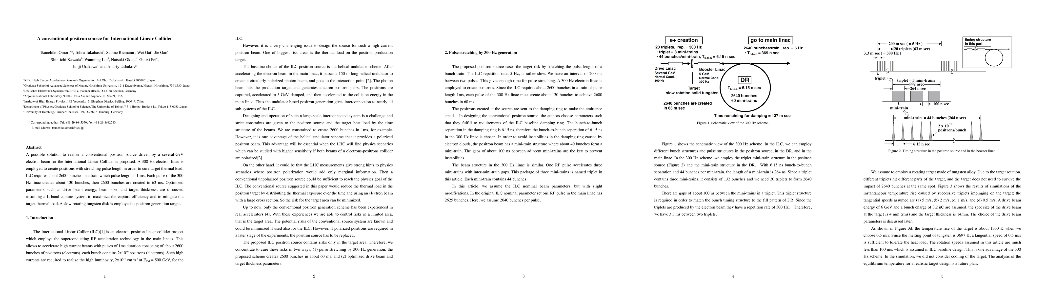 This paper proposes a conventional positron source driven by a several-GeV electron beam for the International Linear Collider (ILC), utilizing a 300 Hz electron linac to mitigate thermal load. It discusses optimized parameters and employs a slow rotating tungsten disk as the positron generation target.