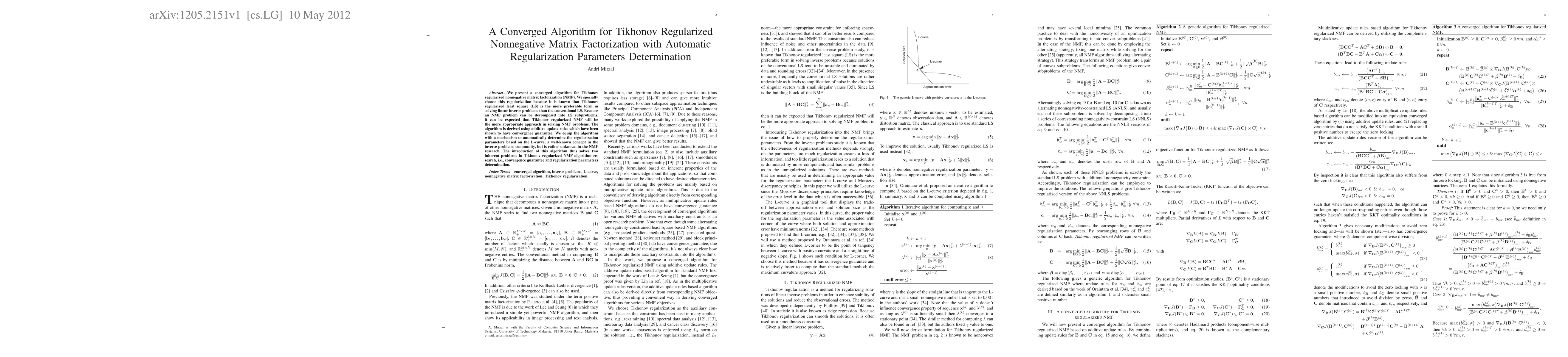 This paper introduces a converged algorithm for Tikhonov regularized nonnegative matrix factorization (NMF) that uses additive update rules for convergence guarantee. It also includes an automatic method for determining regularization parameters via the L-curve, addressing both convergence and parameter determination issues in NMF research.