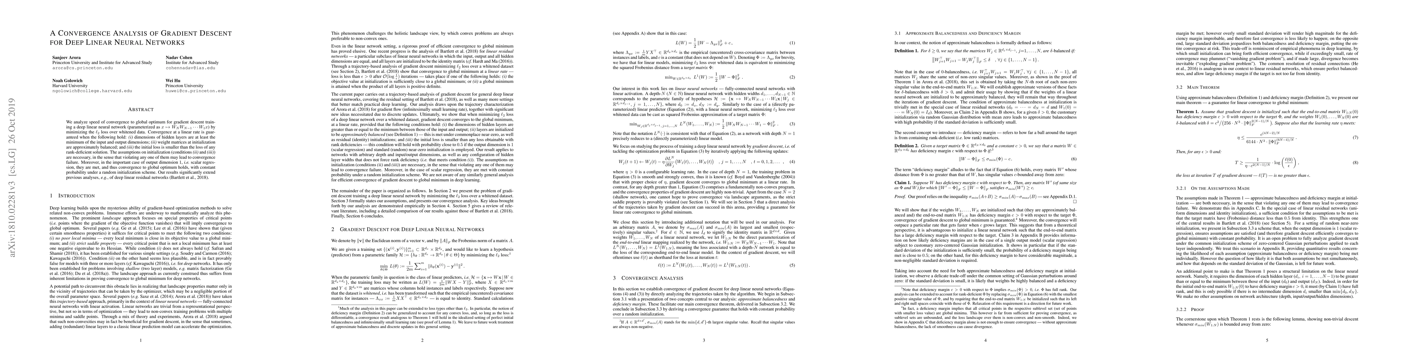 We analyze speed of convergence to global optimum for gradient descent training a deep linear neural network (parameterized as $x \mapsto W_N W_{N-1} \cdots W_1 x$) by minimizing the $\ell_2$ loss over whitened data. Convergence at a linear rate is guaranteed when the following hold: (i) dimensions of hidden layers are at least the minimum of the input and output dimensions; (ii) weight matrices at initialization are approximately balanced; and (iii) the initial loss is smaller than the loss of any rank-deficient solution. The assumptions on initialization (conditions (ii) and (iii)) are necessary, in the sense that violating any one of them may lead to convergence failure. Moreover, in the important case of output dimension 1, i.e. scalar regression, they are met, and thus convergence to global optimum holds, with constant probability under a random initialization scheme. Our results significantly extend previous analyses, e.g., of deep linear residual networks (Bartlett et al., 2018).