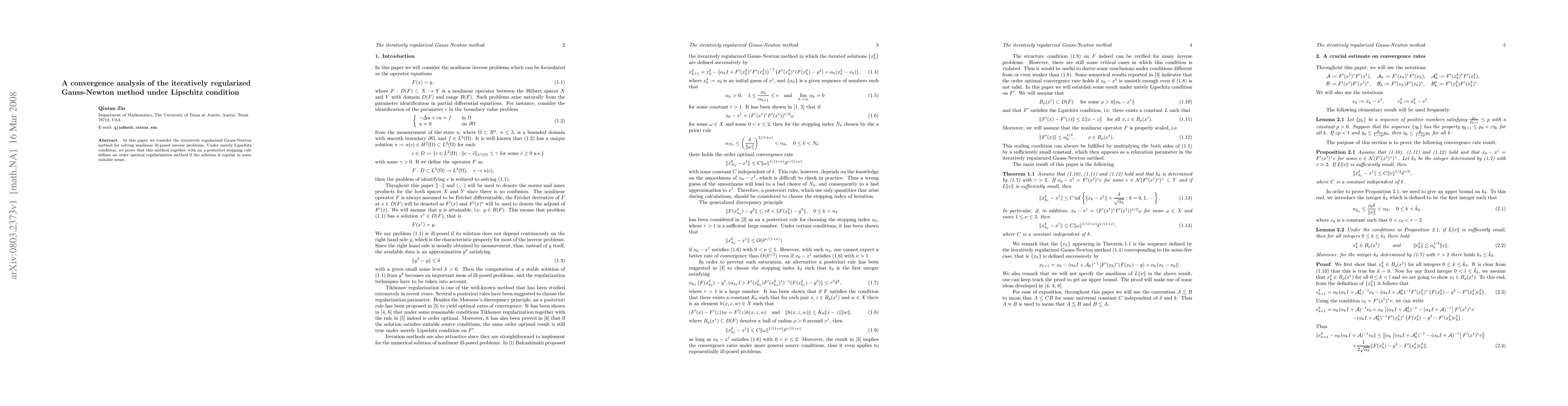 This paper proves the convergence of the iteratively regularized Gauss-Newton method for solving nonlinear ill-posed inverse problems under Lipschitz conditions, demonstrating it to be an order optimal regularization method when the solution is regular. An a posteriori stopping rule is employed to enhance its effectiveness.
