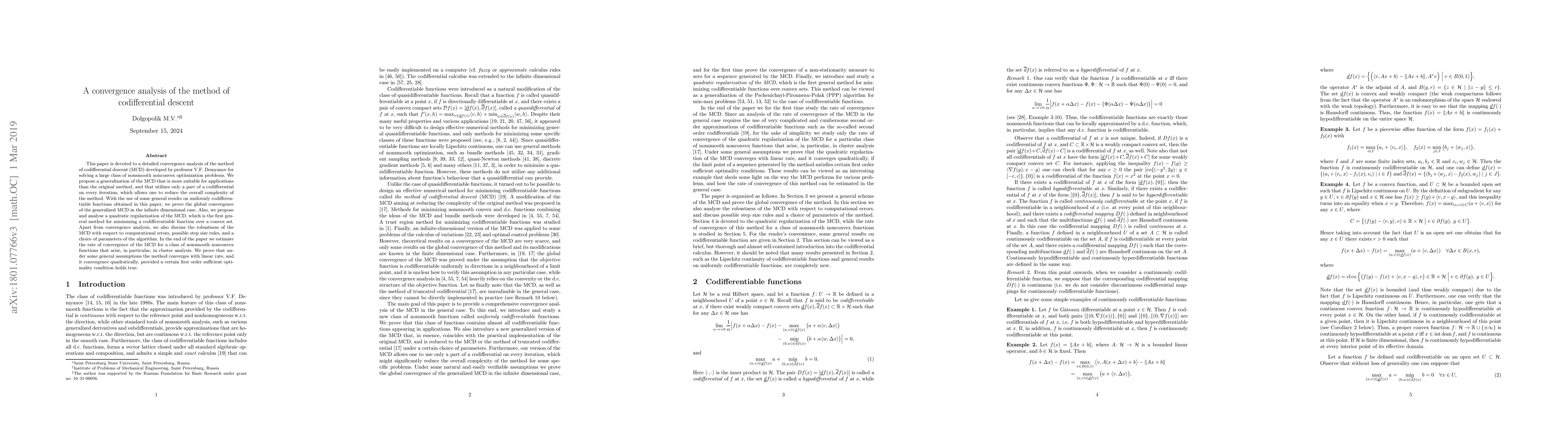 This paper analyzes the convergence of the codifferential descent method (MCD) for solving nonsmooth nonconvex optimization problems, proposing a generalized version with reduced complexity. It proves global convergence in infinite dimensions and discusses the robustness, step size rules, and parameter choices of the MCD.