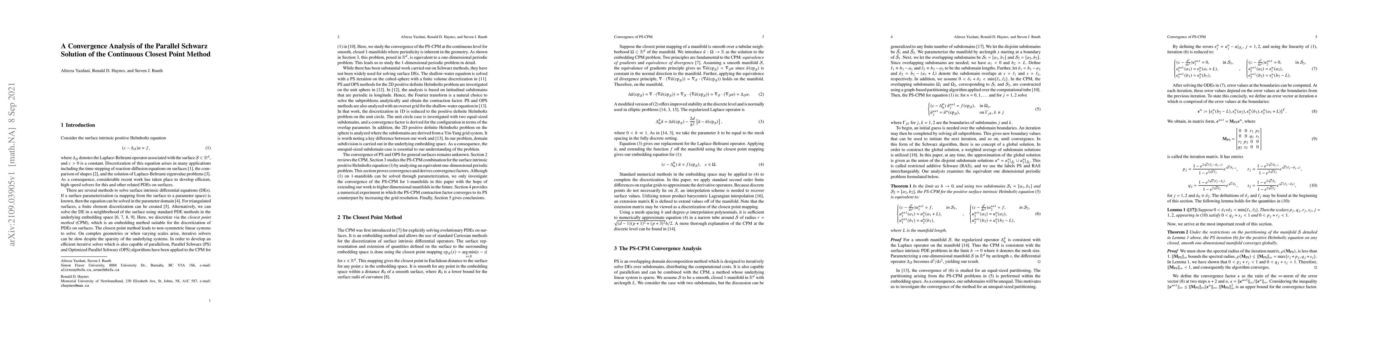 This paper explores the convergence analysis of the parallel Schwarz method applied to the continuous closest point method (CPM) for solving surface intrinsic PDEs, specifically the positive Helmholtz equation, by transforming the problem into a finite-difference system in the embedding space. The study focuses on the robustness of domain decomposition methods for large, sparse, and non-symmetric linear systems arising from surface PDEs.