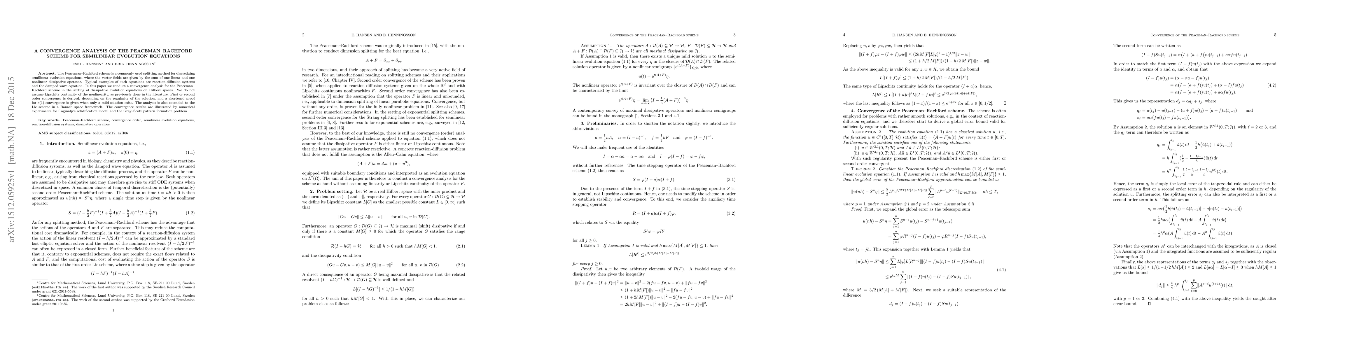 This paper analyzes the convergence of the Peaceman-Rachford scheme for semilinear evolution equations, deriving first or second order convergence without assuming Lipschitz continuity of the nonlinearity. Numerical experiments demonstrate the method's effectiveness for Caginalp's solidification model and the Gray-Scott pattern formation problem.