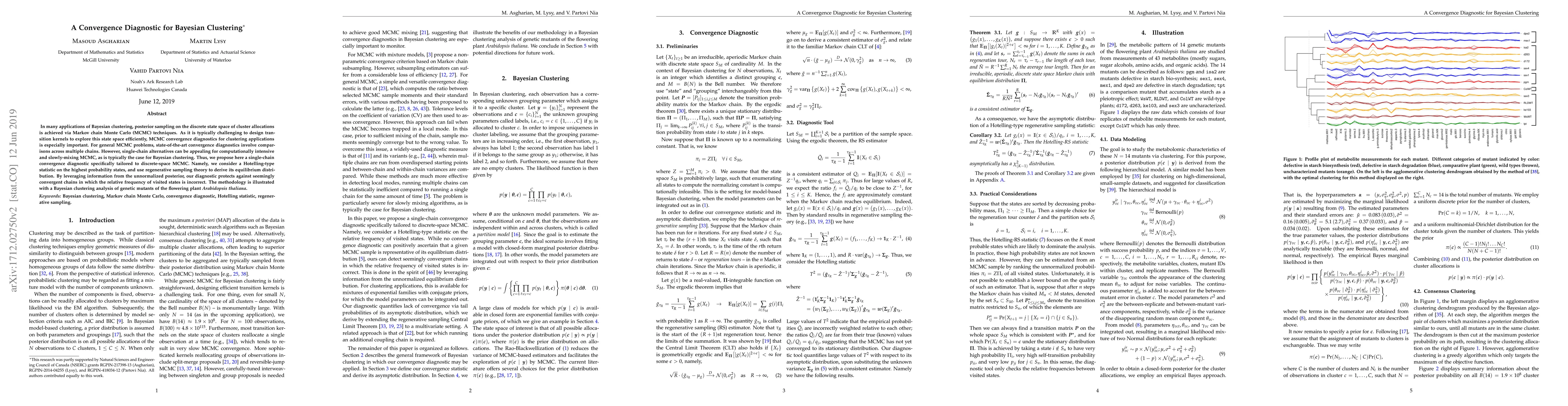 This paper proposes a single-chain convergence diagnostic for Bayesian clustering using MCMC, focusing on the highest probability states. It leverages a Hotelling-type statistic and regenerative sampling theory to derive its equilibrium distribution, ensuring accurate detection of convergence despite computational challenges.