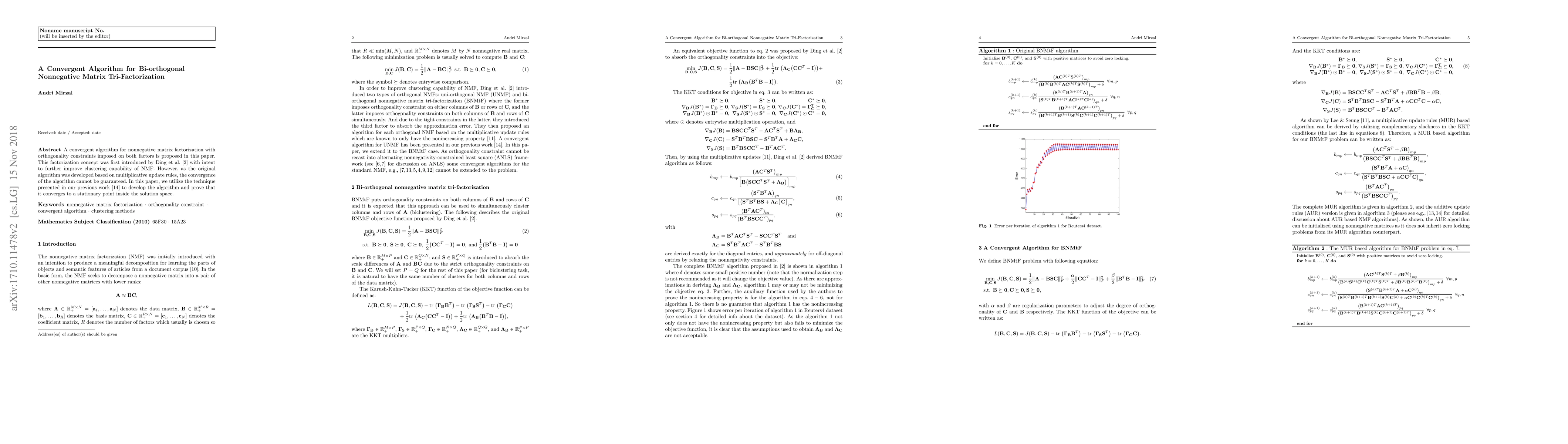 This paper proposes a convergent algorithm for bi-orthogonal nonnegative matrix tri-factorization, improving upon previous multiplicative update rules by ensuring convergence to a stationary point within the solution space. The method aims to enhance the clustering capability introduced by Ding et al.