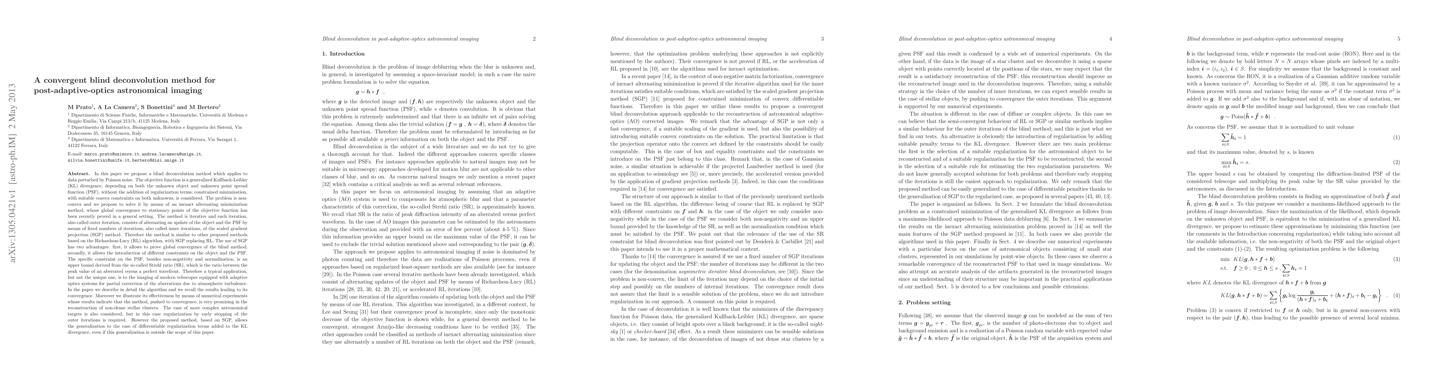 In this paper we propose a blind deconvolution method which applies to data perturbed by Poisson noise. The objective function is a generalized Kullback-Leibler divergence, depending on both the unknown object and unknown point spread function (PSF), without the addition of regularization terms; constrained minimization, with suitable convex constraints on both unknowns, is considered. The problem is nonconvex and we propose to solve it by means of an inexact alternating minimization method, whose global convergence to stationary points of the objective function has been recently proved in a general setting. The method is iterative and each iteration, also called outer iteration, consists of alternating an update of the object and the PSF by means of fixed numbers of iterations, also called inner iterations, of the scaled gradient projection (SGP) method. The use of SGP has two advantages: first, it allows to prove global convergence of the blind method; secondly, it allows the introduction of different constraints on the object and the PSF. The specific constraint on the PSF, besides non-negativity and normalization, is an upper bound derived from the so-called Strehl ratio, which is the ratio between the peak value of an aberrated versus a perfect wavefront. Therefore a typical application is the imaging of modern telescopes equipped with adaptive optics systems for partial correction of the aberrations due to atmospheric turbulence. In the paper we describe the algorithm and we recall the results leading to its convergence. Moreover we illustrate its effectiveness by means of numerical experiments whose results indicate that the method, pushed to convergence, is very promising in the reconstruction of non-dense stellar clusters. The case of more complex astronomical targets is also considered, but in this case regularization by early stopping of the outer iterations is required.