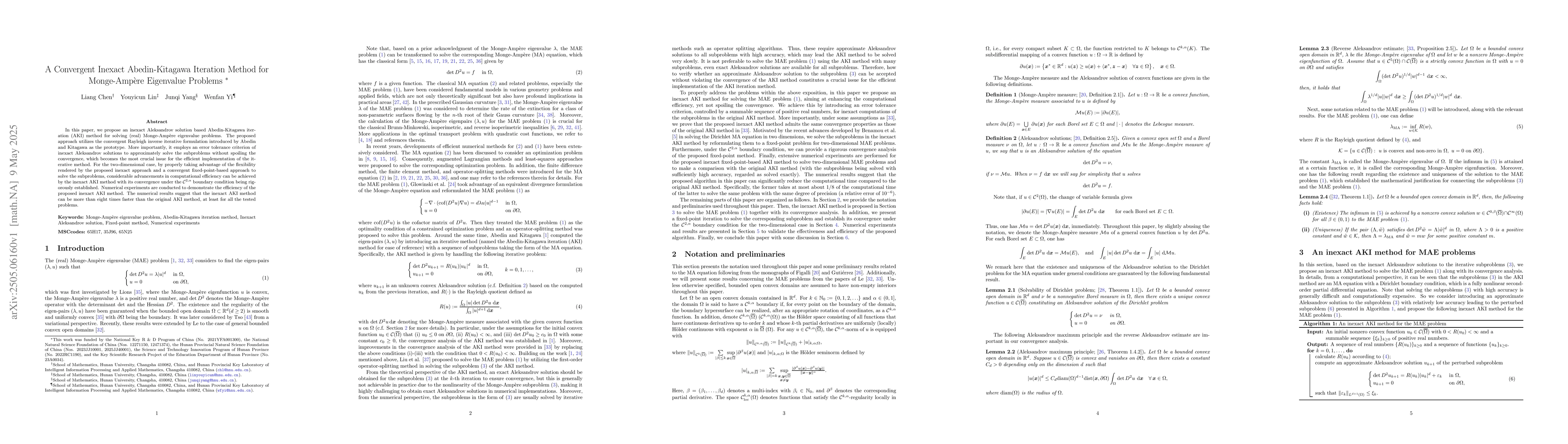 Researchers propose an inexact Aleksandrov solution based Abedin-Kitagawa iteration method to solve Monge-Ampère eigenvalue problems, achieving significant computational efficiency improvements over the original method.