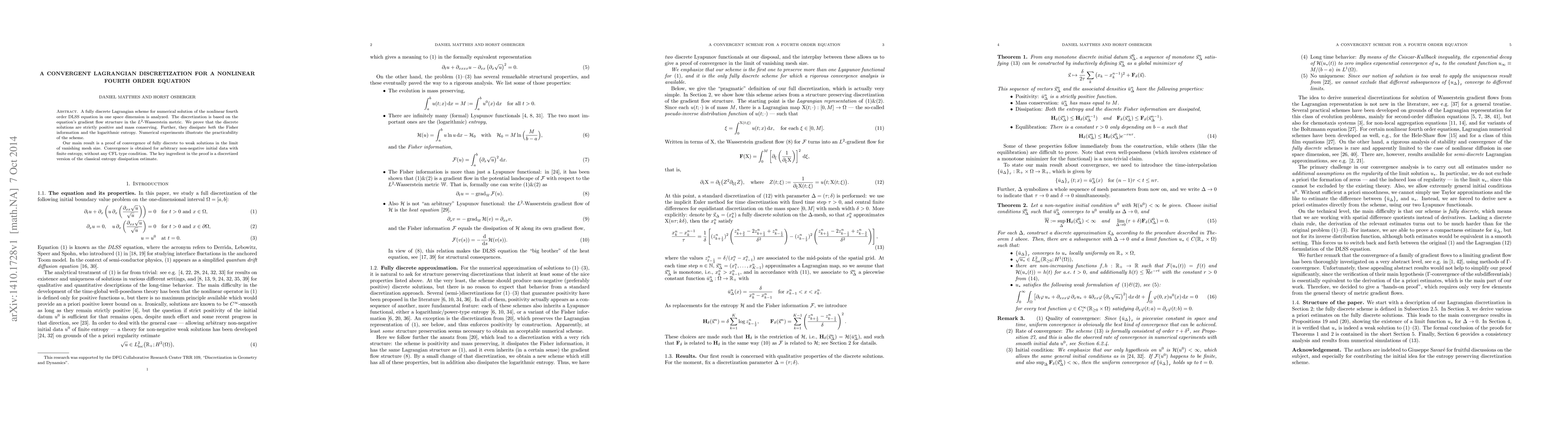 A fully discrete Lagrangian scheme for numerical solution of the nonlinear fourth order DLSS equation in one space dimension is analyzed. The discretization is based on the equation's gradient flow structure in the $L^2$-Wasserstein metric. We prove that the discrete solutions are strictly positive and mass conserving. Further, they dissipate both the Fisher information and the logarithmic entropy. Numerical experiments illustrate the practicability of the scheme. Our main result is a proof of convergence of fully discrete to weak solutions in the limit of vanishing mesh size. Convergence is obtained for arbitrary non-negative initial data with finite entropy, without any CFL type condition. The key ingredient in the proof is a discretized version of the classical entropy dissipation estimate.