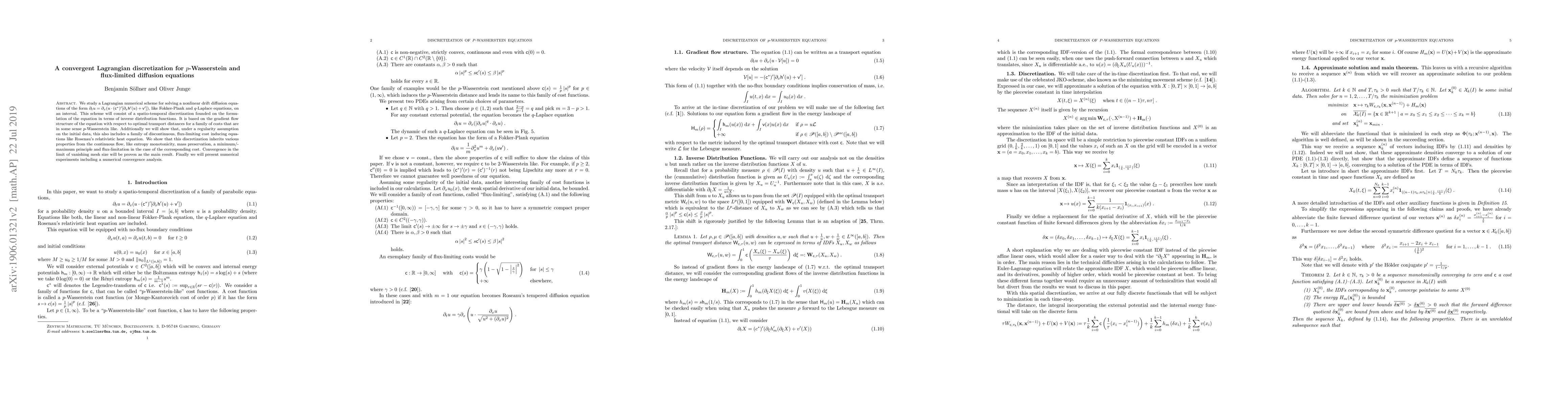 The research paper presents a Lagrangian numerical scheme for solving a specific nonlinear drift-diffusion equation, leveraging its gradient flow structure related to optimal transport distances. This method, applicable to a family of p-Wasserstein like costs, ensures properties such as entropy monotonicity, mass preservation, and flux-limitation. The scheme's convergence in the limit of vanishing mesh size is proven as the main result, supported by numerical experiments and a convergence analysis.