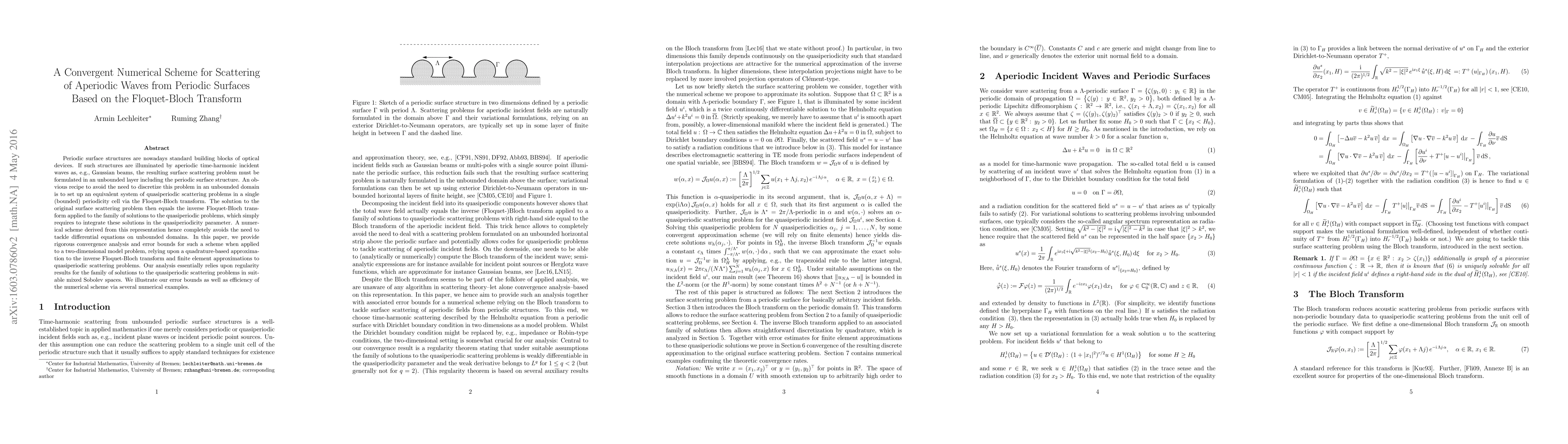 This paper presents a numerical scheme for scattering aperiodic waves from periodic surfaces using the Floquet-Bloch transform, avoiding unbounded domain discretization. The scheme's convergence and error bounds are rigorously analyzed and demonstrated through numerical examples.