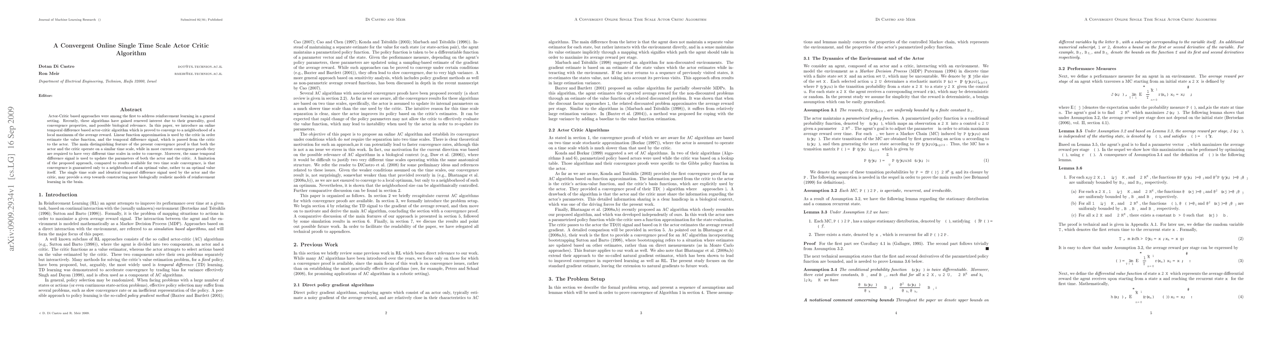 This paper introduces a novel online single time scale actor-critic algorithm that converges to a local maximum of average reward, using a shared temporal difference signal for both actor and critic updates. Unlike traditional two time scale methods, this approach operates on a similar time scale for both components, potentially offering a more biologically plausible model.