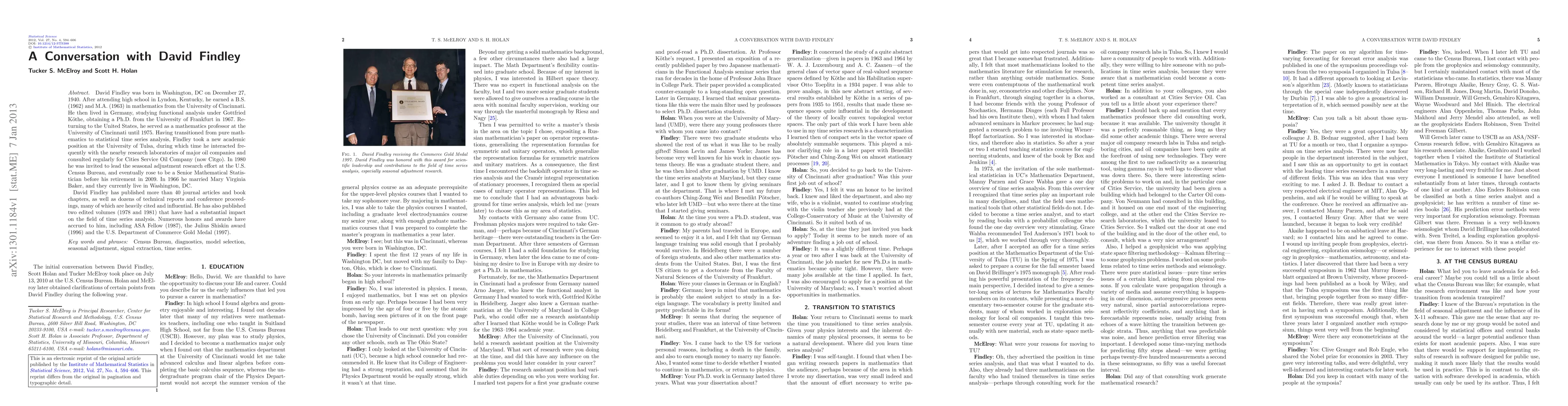 David Findley was born in Washington, DC on December 27, 1940. After attending high school in Lyndon, Kentucky, he earned a B.S. (1962) and M.A. (1963) in mathematics from the University of Cincinnati. He then lived in Germany, studying functional analysis under Gottfried K\"{o}the, obtaining a Ph.D. from the University of Frankfurt in 1967. Returning to the United States, he served as a mathematics professor at the University of Cincinnati until 1975. Having transitioned from pure mathematics to statistical time series analysis, Findley took a new academic position at the University of Tulsa, during which time he interacted frequently with the nearby research laboratories of major oil companies and consulted regularly for Cities Service Oil Company (now Citgo). In 1980 he was invited to lead the seasonal adjustment research effort at the U.S. Census Bureau, and eventually rose to be a Senior Mathematical Statistician before his retirement in 2009. In 1966 he married Mary Virginia Baker, and they currently live in Washington, DC. David Findley has published more than 40 journal articles and book chapters, as well as dozens of technical reports and conference proceedings, many of which are heavily cited and influential. He has also published two edited volumes (1978 and 1981) that have had a substantial impact on the field of time series analysis. Numerous honors and awards have accrued to him, including ASA Fellow (1987), the Julius Shiskin award (1996) and the U.S. Department of Commerce Gold Medal (1997).