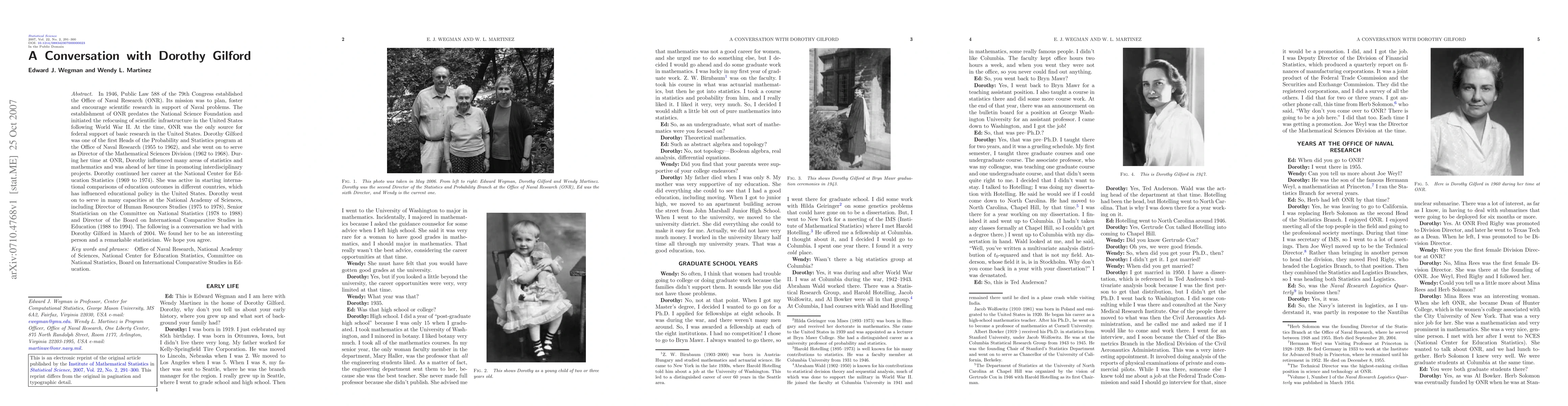 In 1946, Public Law 588 of the 79th Congress established the Office of Naval Research (ONR). Its mission was to plan, foster and encourage scientific research in support of Naval problems. The establishment of ONR predates the National Science Foundation and initiated the refocusing of scientific infrastructure in the United States following World War II. At the time, ONR was the only source for federal support of basic research in the United States. Dorothy Gilford was one of the first Heads of the Probability and Statistics program at the Office of Naval Research (1955 to 1962), and she went on to serve as Director of the Mathematical Sciences Division (1962 to 1968). During her time at ONR, Dorothy influenced many areas of statistics and mathematics and was ahead of her time in promoting interdisciplinary projects. Dorothy continued her career at the National Center for Education Statistics (1969 to 1974). She was active in starting international comparisons of education outcomes in different countries, which has influenced educational policy in the United States. Dorothy went on to serve in many capacities at the National Academy of Sciences, including Director of Human Resources Studies (1975 to 1978), Senior Statistician on the Committee on National Statistics (1978 to 1988) and Director of the Board on International Comparative Studies in Education (1988 to 1994). The following is a conversation we had with Dorothy Gilford in March of 2004. We found her to be an interesting person and a remarkable statistician. We hope you agree.