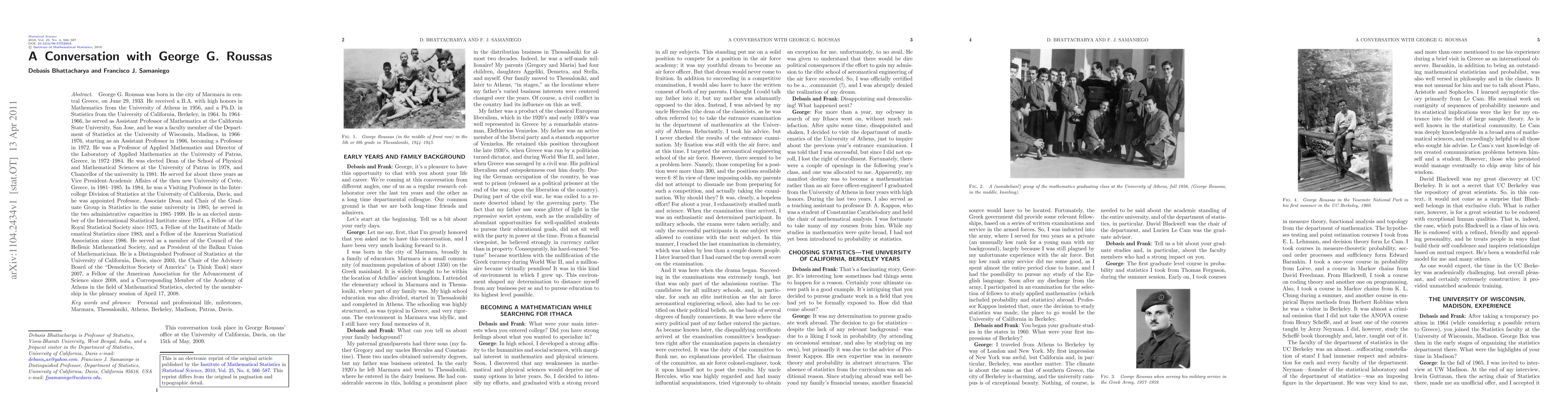 George G. Roussas was born in the city of Marmara in central Greece, on June 29, 1933. He received a B.A. with high honors in Mathematics from the University of Athens in 1956, and a Ph.D. in Statistics from the University of California, Berkeley, in 1964. In 1964--1966, he served as Assistant Professor of Mathematics at the California State University, San Jose, and he was a faculty member of the Department of Statistics at the University of Wisconsin, Madison, in 1966--1976, starting as an Assistant Professor in 1966, becoming a Professor in 1972. He was a Professor of Applied Mathematics and Director of the Laboratory of Applied Mathematics at the University of Patras, Greece, in 1972--1984. He was elected Dean of the School of Physical and Mathematical Sciences at the University of Patras in 1978, and Chancellor of the university in 1981. He served for about three years as Vice President-Academic Affairs of the then new University of Crete, Greece, in 1981--1985. In 1984, he was a Visiting Professor in the Intercollege Division of Statistics at the University of California, Davis, and he was appointed Professor, Associate Dean and Chair of the Graduate Group in Statistics in the same university in 1985; he served in the two administrative capacities in 1985--1999. He is an elected member of the International Statistical Institute since 1974, a Fellow of the Royal Statistical Society since 1975, a Fellow of the Institute of Mathematical Statistics since 1983, and a Fellow of the American Statistical Association since 1986. He served as a member of the Council of the Hellenic Mathematical Society, and as President of the Balkan Union of Mathematicians.