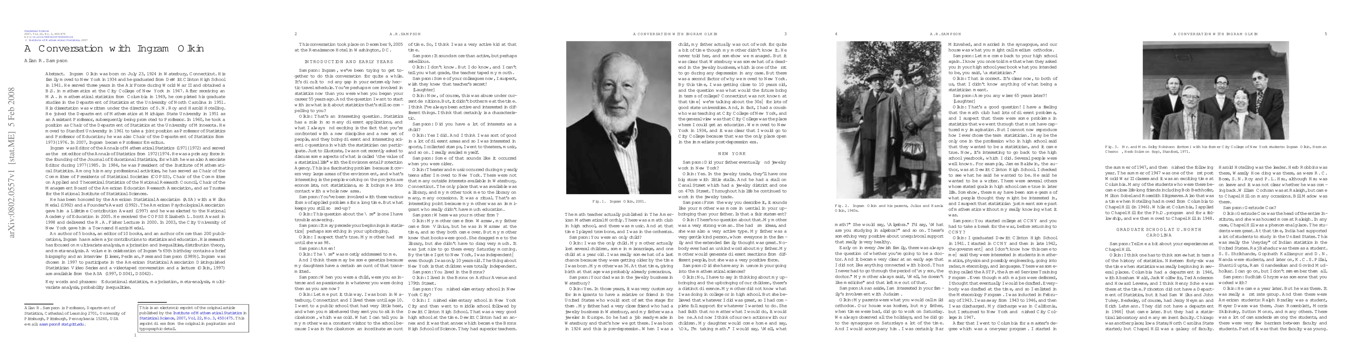 Ingram Olkin was born on July 23, 1924 in Waterbury, Connecticut. His family moved to New York in 1934 and he graduated from DeWitt Clinton High School in 1941. He served three years in the Air Force during World War II and obtained a B.S. in mathematics at the City College of New York in 1947. After receiving an M.A. in mathematical statistics from Columbia in 1949, he completed his graduate studies in the Department of Statistics at the University of North Carolina in 1951. His dissertation was written under the direction of S. N. Roy and Harold Hotelling. He joined the Department of Mathematics at Michigan State University in 1951 as an Assistant Professor, subsequently being promoted to Professor. In 1960, he took a position as Chair of the Department of Statistics at the University of Minnesota. He moved to Stanford University in 1961 to take a joint position as Professor of Statistics and Professor of Education; he was also Chair of the Department of Statistics from 1973--1976. In 2007, Ingram became Professor Emeritus. Ingram was Editor of the Annals of Mathematical Statistics (1971--1972) and served as the first editor of the Annals of Statistics from 1972--1974. He was a primary force in the founding of the Journal of Educational Statistics, for which he was also Associate Editor during 1977--1985. In 1984, he was President of the Institute of Mathematical Statistics. Among his many professional activities, he has served as Chair of the Committee of Presidents of Statistical Societies (COPSS), Chair of the Committee on Applied and Theoretical Statistics of the National Research Council, Chair of the Management Board of the American Education Research Association, and as Trustee for the National Institute of Statistical Sciences. He has been honored by the American Statistical Association (ASA) with a Wilks Medal (1992) and a Founder's Award (1992). The American Psychological Association gave him a Lifetime Contribution Award (1997) and he was elected to the National Academy of Education in 2005. He received the COPSS Elizabeth L. Scott Award in 1998 and delivered the R. A. Fisher Lecture in 2000. In 2003, the City University of New York gave him a Townsend Harris Medal. An author of 5 books, an editor of 10 books, and an author of more than 200 publications, Ingram has made major contributions to statistics and education. His research has focused on multivariate analysis, majorization and inequalities, distribution theory, and meta-analysis. A volume in celebration of Ingram's 65th birthday contains a brief biography and an interview [Gleser, Perlman, Press and Sampson (1989)]. Ingram was chosen in 1997 to participate in the American Statistical Association Distinguished Statistician Video Series and a videotaped conversation and a lecture (Olkin, 1997) are available from the ASA (1997, DS041, DS042).