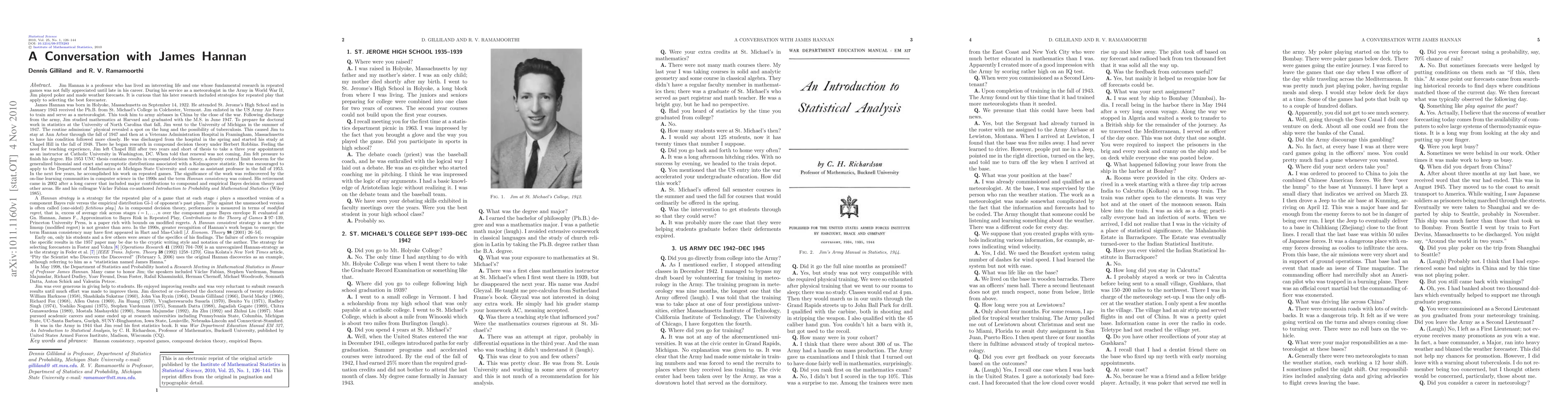 Jim Hannan is a professor who has lived an interesting life and one whose fundamental research in repeated games was not fully appreciated until late in his career. During his service as a meteorologist in the Army in World War II, Jim played poker and made weather forecasts. It is curious that his later research included strategies for repeated play that apply to selecting the best forecaster. James Hannan was born in Holyoke, Massachusetts on September 14, 1922. He attended St. Jerome's High School and in January 1943 received the Ph.B. from St. Michael's College in Colchester, Vermont. Jim enlisted in the US Army Air Force to train and serve as a meteorologist. This took him to army airbases in China by the close of the war. Following discharge from the army, Jim studied mathematics at Harvard and graduated with the M.S. in June 1947. To prepare for doctoral work in statistics at the University of North Carolina that fall, Jim went to the University of Michigan in the summer of 1947. The routine admissions' physical revealed a spot on the lung and the possibility of tuberculosis. This caused Jim to stay at Ann Arbor through the fall of 1947 and then at a Veterans Administration Hospital in Framingham, Massachusetts to have his condition followed more closely. He was discharged from the hospital in the spring and started his study at Chapel Hill in the fall of 1948. There he began research in compound decision theory under Herbert Robbins. Feeling the need for teaching experience, Jim left Chapel Hill after two years and short of thesis to take a three year appointment as an instructor at Catholic University in Washington, DC. When told that renewal was not coming, Jim felt pressure to finish his degree.