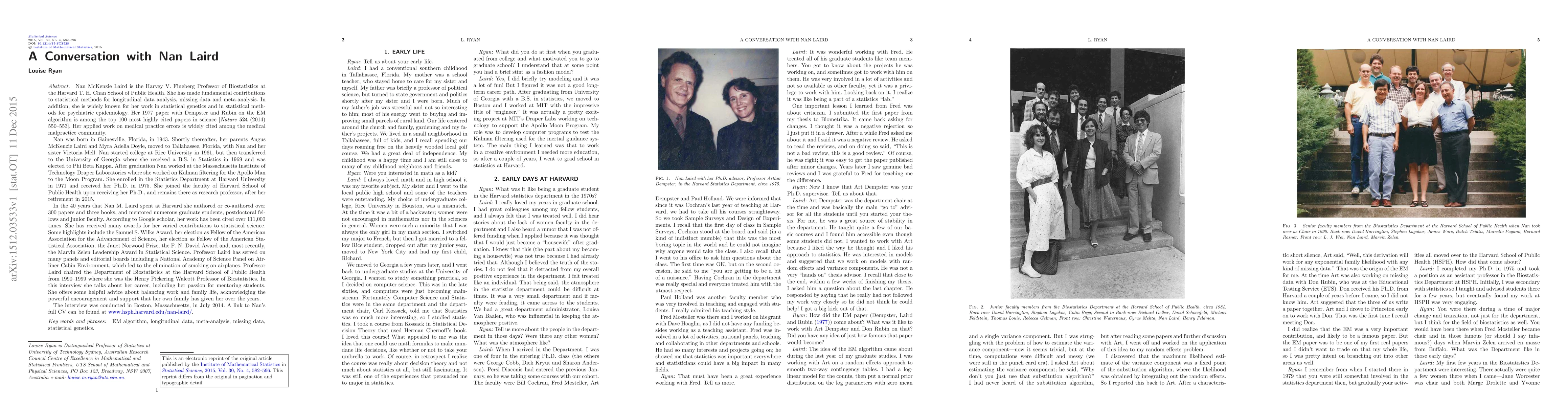 Nan McKenzie Laird is the Harvey V. Fineberg Professor of Biostatistics at the Harvard T. H. Chan School of Public Health. She has made fundamental contributions to statistical methods for longitudinal data analysis, missing data and meta-analysis. In addition, she is widely known for her work in statistical genetics and in statistical methods for psychiatric epidemiology. Her 1977 paper with Dempster and Rubin on the EM algorithm is among the top 100 most highly cited papers in science [Nature 524 (2014) 550-553]. Her applied work on medical practice errors is widely cited among the medical malpractice community. Nan was born in Gainesville, Florida, in 1943. Shortly thereafter, her parents Angus McKenzie Laird and Myra Adelia Doyle, moved to Tallahassee, Florida, with Nan and her sister Victoria Mell. Nan started college at Rice University in 1961, but then transferred to the University of Georgia where she received a B.S. in Statistics in 1969 and was elected to Phi Beta Kappa. After graduation Nan worked at the Massachusetts Institute of Technology Draper Laboratories where she worked on Kalman filtering for the Apollo Man to the Moon Program. She enrolled in the Statistics Department at Harvard University in 1971 and received her Ph.D. in 1975. She joined the faculty of Harvard School of Public Health upon receiving her Ph.D., and remains there as research professor, after her retirement in 2015. The interview was conducted in Boston, Massachusetts, in July 2014. A link to Nan's full CV can be found at \surlwww.hsph.harvard.edu/nan-laird/.