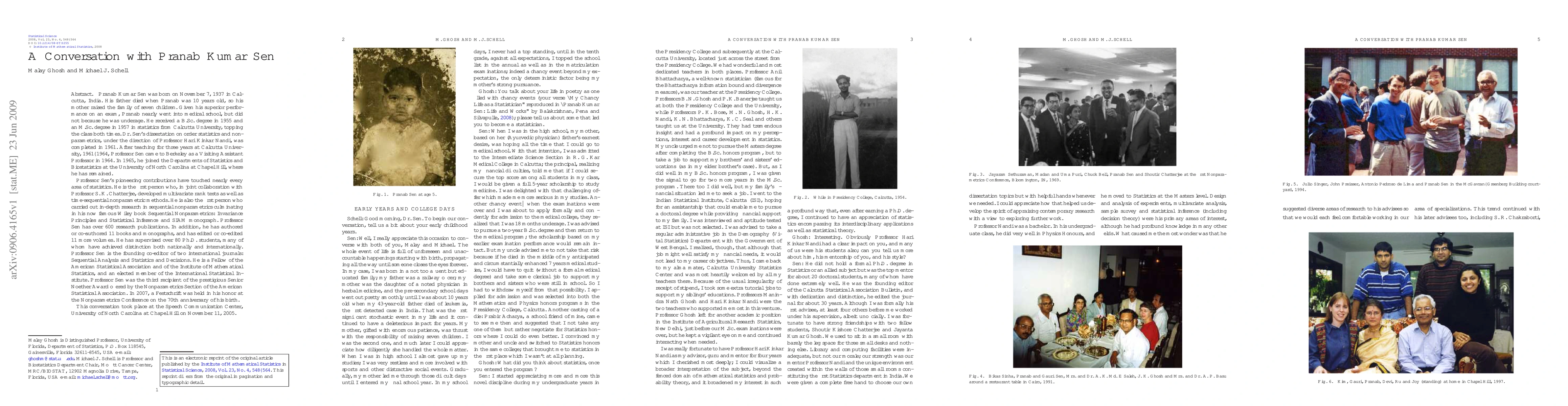 Pranab Kumar Sen was born on November 7, 1937 in Calcutta, India. His father died when Pranab was 10 years old, so his mother raised the family of seven children. Given his superior performance on an exam, Pranab nearly went into medical school, but did not because he was underage. He received a B.Sc. degree in 1955 and an M.Sc. degree in 1957 in statistics from Calcutta University, topping the class both times. Dr. Sen's dissertation on order statistics and nonparametrics, under the direction of Professor Hari Kinkar Nandi, was completed in 1961. After teaching for three years at Calcutta University, 1961--1964, Professor Sen came to Berkeley as a Visiting Assistant Professor in 1964. In 1965, he joined the Departments of Statistics and Biostatistics at the University of North Carolina at Chapel Hill, where he has remained. Professor Sen's pioneering contributions have touched nearly every area of statistics. He is the first person who, in joint collaboration with Professor S. K. Chatterjee, developed multivariate rank tests as well as time-sequential nonparametric methods. He is also the first person who carried out in-depth research in sequential nonparametrics culminating in his now famous Wiley book Sequential Nonparametrics: Invariance Principles and Statistical Inference and SIAM monograph. Professor Sen has over 600 research publications. In addition, he has authored or co-authored 11 books and monographs, and has edited or co-edited 11 more volumes. He has supervised over 80 Ph.D. students, many of whom have achieved distinction both nationally and internationally. Professor Sen is the founding co-editor of two international journals: Sequential Analysis and Statistics and Decisions.