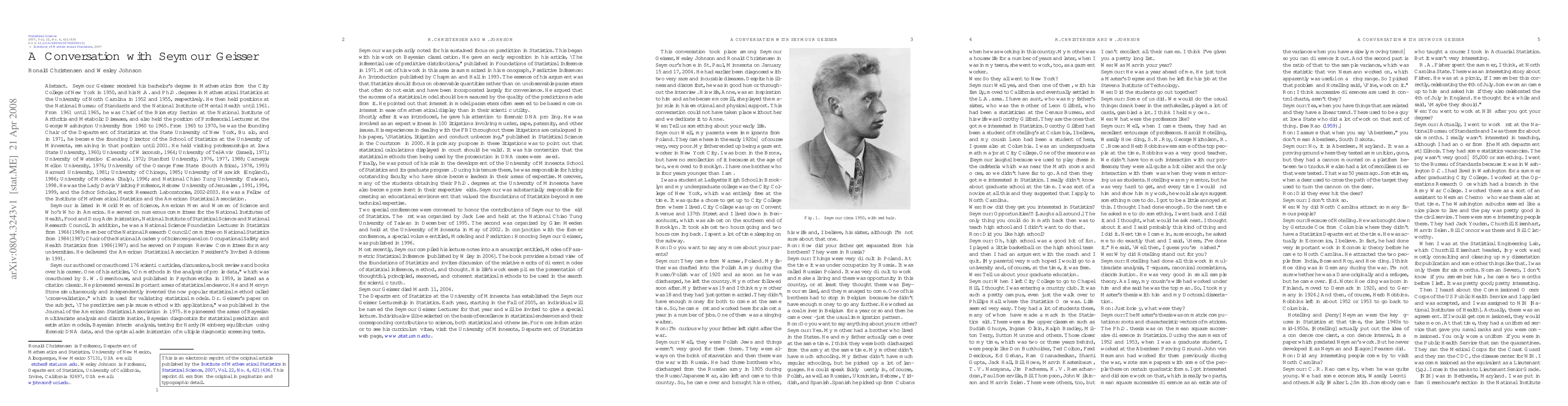 Seymour Geisser received his bachelor's degree in Mathematics from the City College of New York in 1950, and his M.A. and Ph.D. degrees in Mathematical Statistics at the University of North Carolina in 1952 and 1955, respectively. He then held positions at the National Bureau of Standards and the National Institute of Mental Health until 1961. From 1961 until 1965, he was Chief of the Biometry Section at the National Institute of Arthritis and Metabolic Diseases, and also held the position of Professorial Lecturer at the George Washington University from 1960 to 1965. From 1965 to 1970, he was the founding Chair of the Department of Statistics at the State University of New York, Buffalo, and in 1971, he became the founding Director of the School of Statistics at the University of Minnesota, remaining in that position until 2001. He held visiting professorships at Iowa State University, 1960; University of Wisconsin, 1964; University of Tel-Aviv (Israel), 1971; University of Waterloo (Canada), 1972; Stanford University, 1976, 1977, 1988; Carnegie Mellon University, 1976; University of the Orange Free State (South Africa), 1978, 1993; Harvard University, 1981; University of Chicago, 1985; University of Warwick (England), 1986; University of Modena (Italy), 1996; and National Chiao Tung University (Taiwan), 1998. He was the Lady Davis Visiting Professor, Hebrew University of Jerusalem, 1991, 1994, 1999, and the Schor Scholar, Merck Research Laboratories, 2002-2003. He was a Fellow of the Institute of Mathematical Statistics and the American Statistical Association.