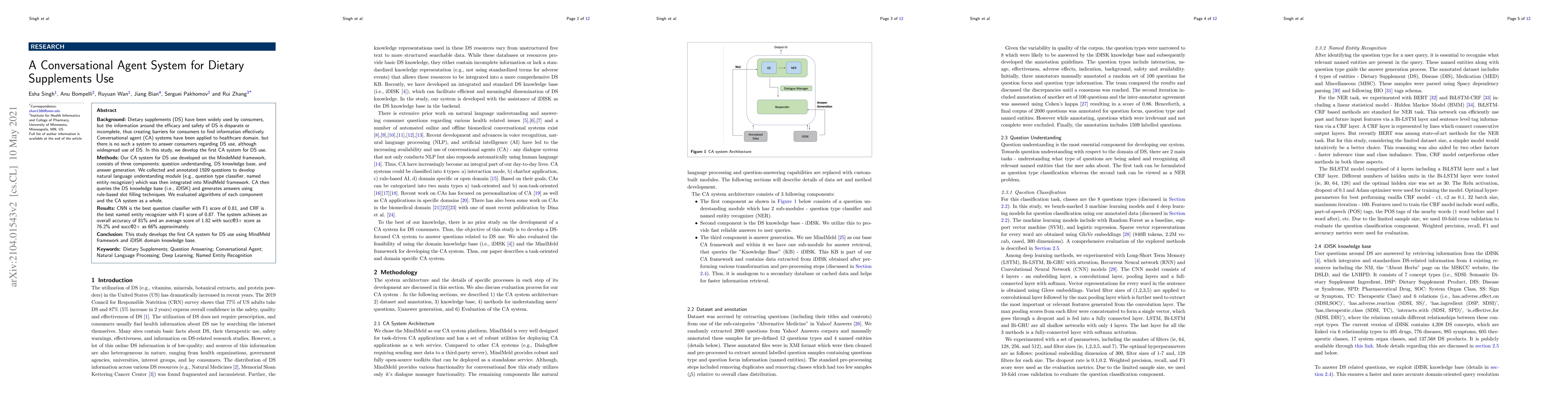 This study develops the first conversational agent system designed to provide consumers with accurate and comprehensive information on the efficacy and safety of dietary supplements, addressing the current gaps in available information. The system aims to enhance informed decision-making regarding dietary supplement use.