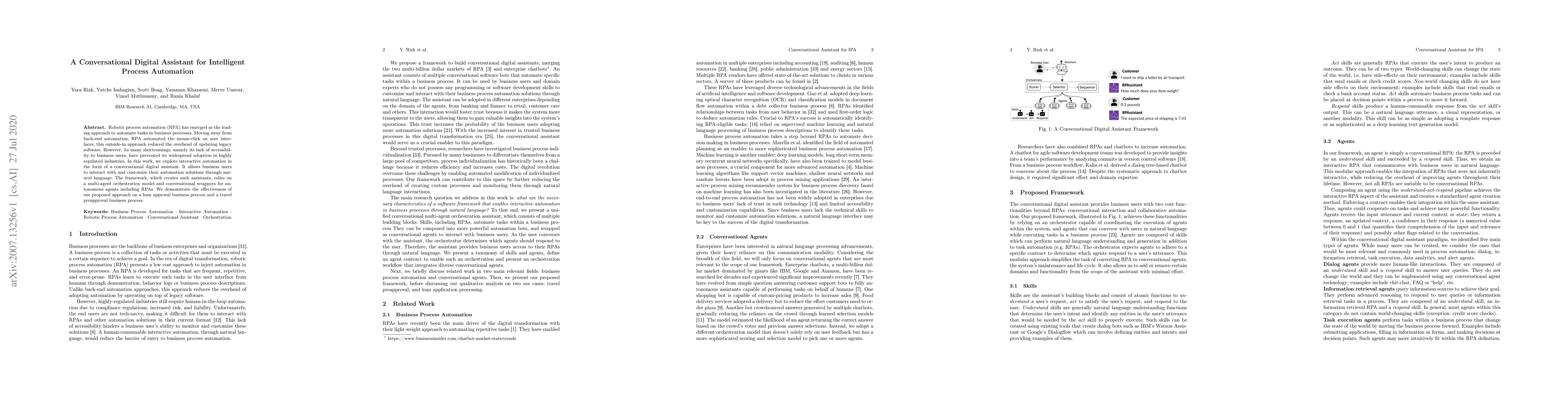 This paper proposes a conversational digital assistant for intelligent process automation to address the shortcomings of traditional robotic process automation (RPA). The assistant enables business users to interact and customize automation solutions via natural language, demonstrating its effectiveness in loan approval and travel preapproval processes.