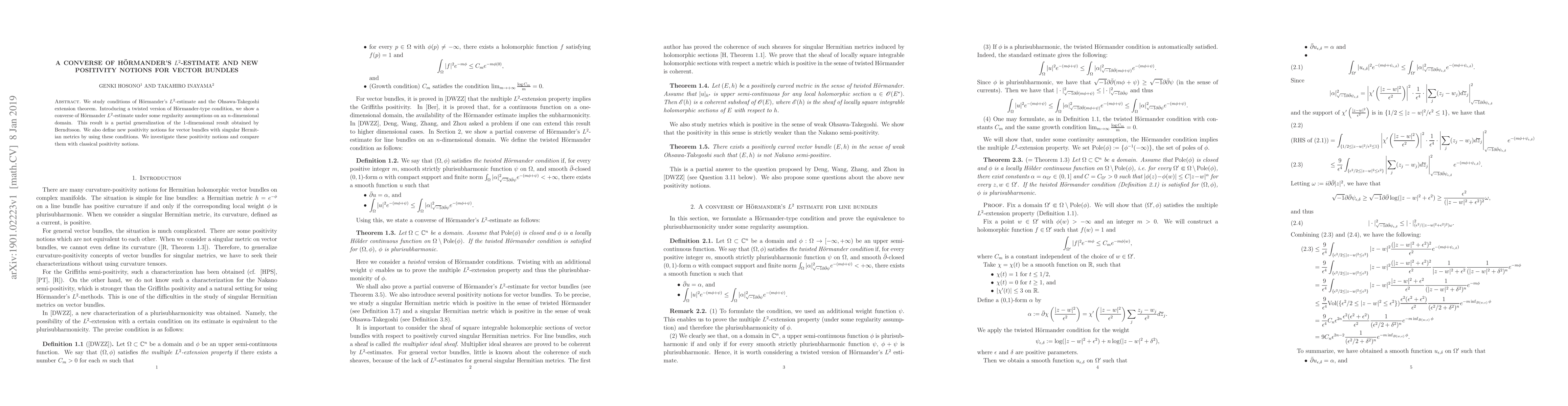 The paper introduces a twisted version of H"ormander-type condition and utilizes regularity assumptions on an n-dimensional domain to show a converse of H"ormander's L^2-estimate. It also defines new positivity notions for vector bundles with singular Hermitian metrics based on these conditions.