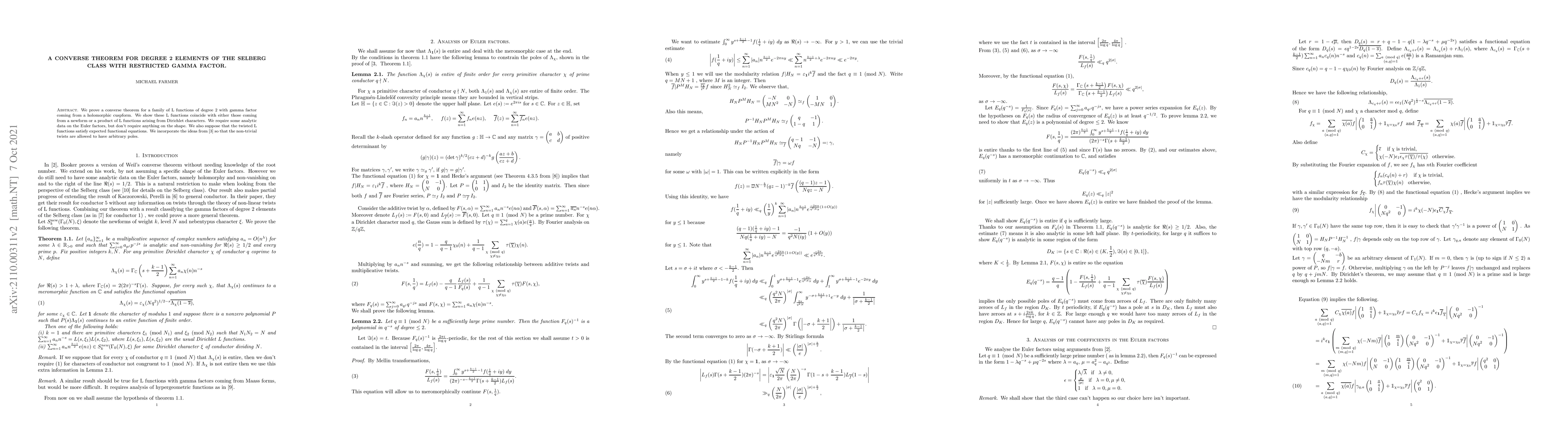 This research establishes a converse theorem for degree 2 elements in the Selberg class with specific gamma factors, showing these L-functions align with newforms or products of Dirichlet character L-functions. It requires analytic data on Euler factors and allows for twisted L-functions with arbitrary poles, offering insights into L-functions' structural properties.