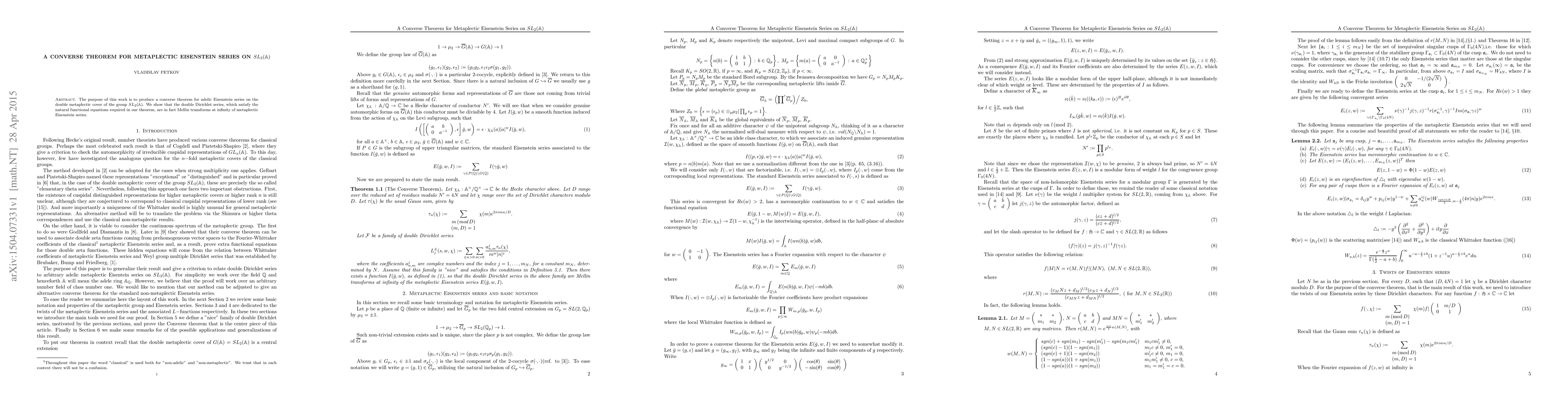The purpose of this work is to produce a converse theorem for adelic Eisenstein series on the double metaplectic cover of the group $SL_2(\mathbb{A})$. We show that the double Dirichlet series, which satisfy the natural functional equations required in our theorem, are in fact Mellin transforms at infinity of metaplectic Eisenstein series.