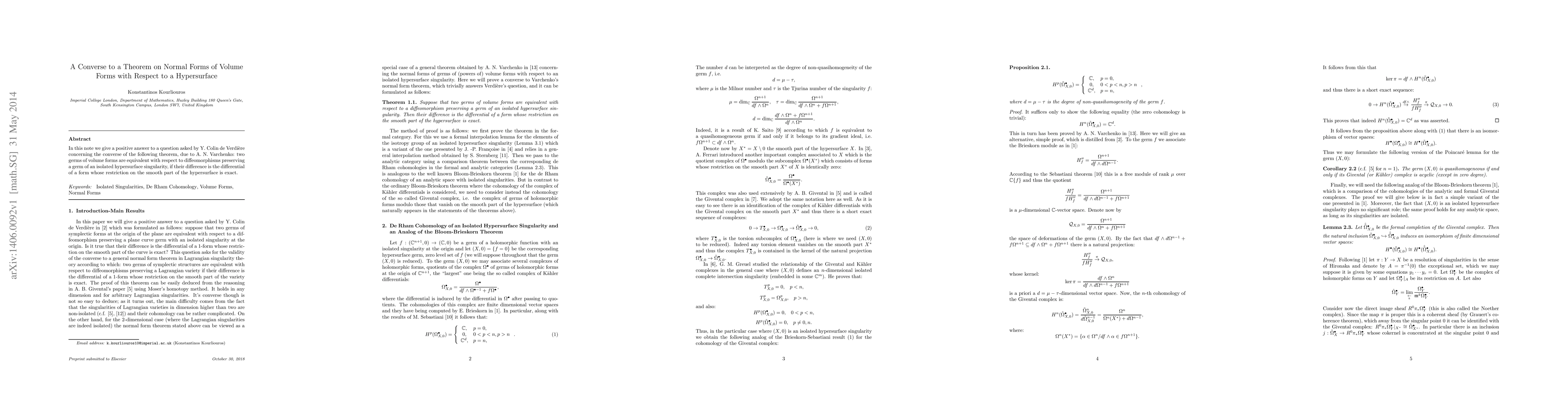 In this note we give a positive answer to a question asked by Y. Colin de Verdi\`ere concerning the converse of the following theorem, due to A. N. Varchenko: two germs of volume forms are equivalent with respect to diffeomorphisms preserving a germ of an isolated hypersurface singularity, if their difference is the differential of a form whose restriction on the smooth part of the hypersurface is exact.