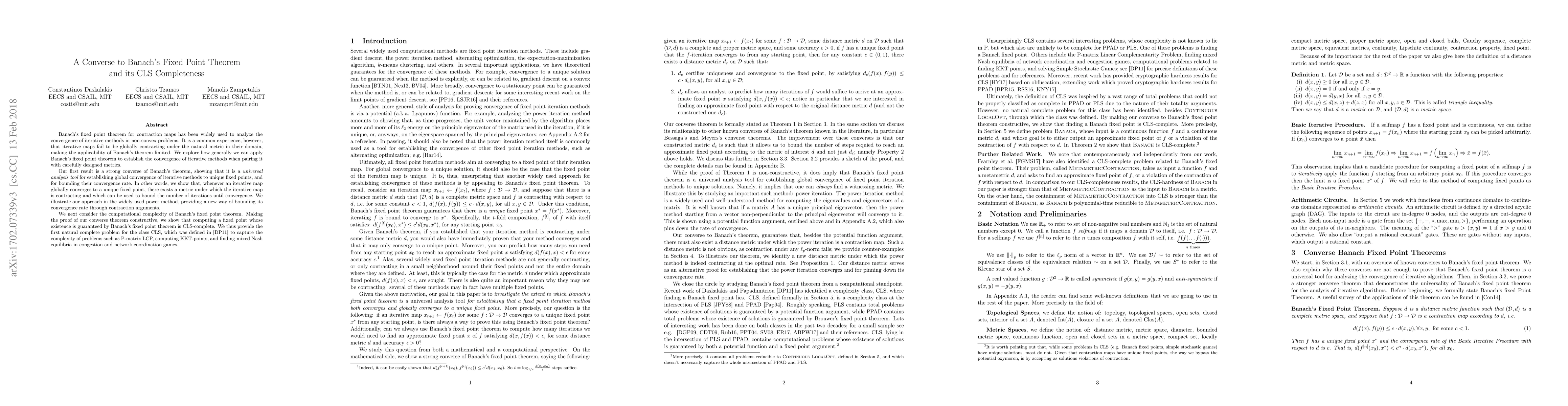 Banach's fixed point theorem for contraction maps has been widely used to analyze the convergence of iterative methods in non-convex problems. It is a common experience, however, that iterative maps fail to be globally contracting under the natural metric in their domain, making the applicability of Banach's theorem limited. We explore how generally we can apply Banach's fixed point theorem to establish the convergence of iterative methods when pairing it with carefully designed metrics. Our first result is a strong converse of Banach's theorem, showing that it is a universal analysis tool for establishing global convergence of iterative methods to unique fixed points, and for bounding their convergence rate. In other words, we show that, whenever an iterative map globally converges to a unique fixed point, there exists a metric under which the iterative map is contracting and which can be used to bound the number of iterations until convergence. We illustrate our approach in the widely used power method, providing a new way of bounding its convergence rate through contraction arguments. We next consider the computational complexity of Banach's fixed point theorem. Making the proof of our converse theorem constructive, we show that computing a fixed point whose existence is guaranteed by Banach's fixed point theorem is CLS-complete. We thus provide the first natural complete problem for the class CLS, which was defined in [Daskalakis, Papadimitriou 2011] to capture the complexity of problems such as P-matrix LCP, computing KKT-points, and finding mixed Nash equilibria in congestion and network coordination games.