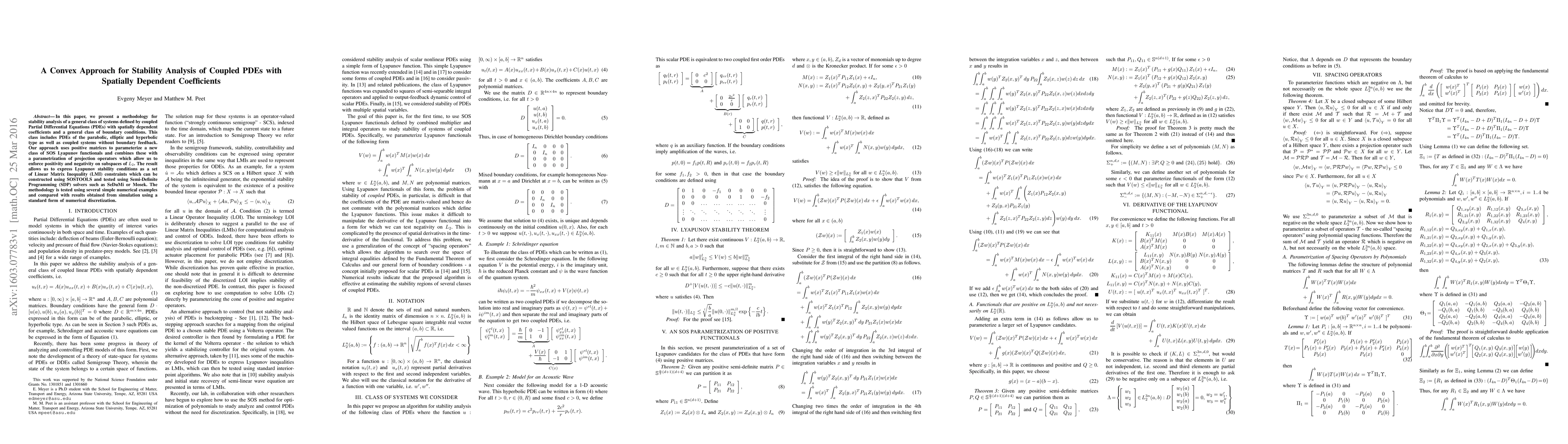 In this paper, we present a methodology for stability analysis of a general class of systems defined by coupled Partial Differential Equations (PDEs) with spatially dependent coefficients and a general class of boundary conditions. This class includes PDEs of the parabolic, elliptic and hyperbolic type as well as coupled systems without boundary feedback. Our approach uses positive matrices to parameterize a new class of SOS Lyapunov functionals and combines these with a parametrization of projection operators which allow us to enforce positivity and negativity on subspaces of L_2. The result allows us to express Lyapunov stability conditions as a set of Linear Matrix Inequality (LMI) constraints which can be constructed using SOSTOOLS and tested using Semi-Definite Programming (SDP) solvers such as SeDuMi or Mosek. The methodology is tested using several simple numerical examples and compared with results obtained from simulation using a standard form of numerical discretization.