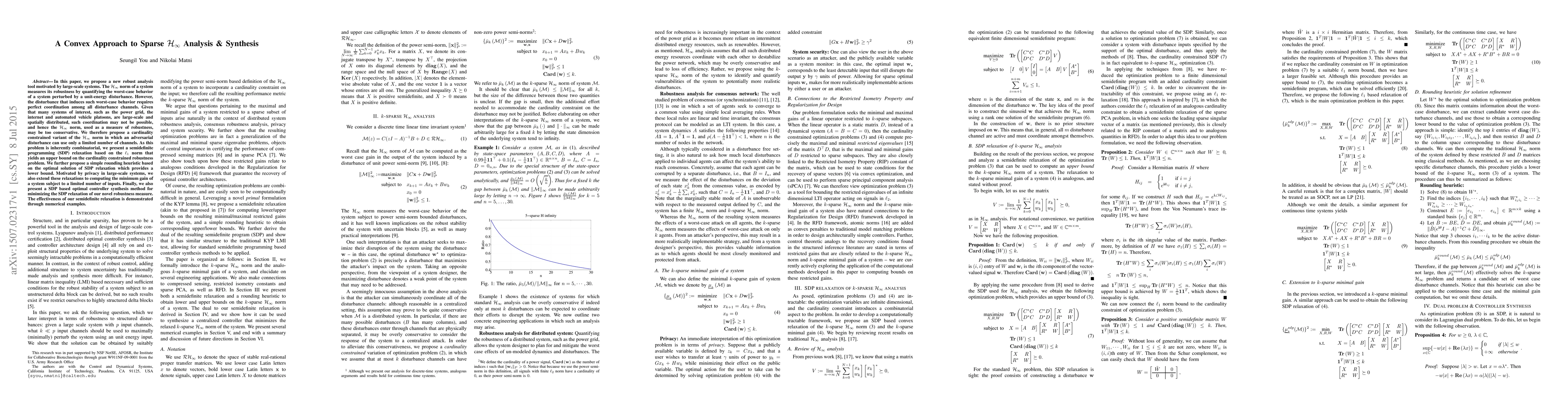 In this paper, we propose a new robust analysis tool motivated by large-scale systems. The H infinity norm of a system measures its robustness by quantifying the worst-case behavior of a system perturbed by a unit-energy disturbance. However, the disturbance that induces such worst-case behavior requires perfect coordination among all disturbance channels. Given that many systems of interest, such as the power grid, the internet and automated vehicle platoons, are large-scale and spatially distributed, such coordination may not be possible, and hence the H infinity norm, used as a measure of robustness, may be too conservative. We therefore propose a cardinality constrained variant of the H infinity norm in which an adversarial disturbance can use only a limited number of channels. As this problem is inherently combinatorial, we present a semidefinite programming (SDP) relaxation based on the l1 norm that yields an upper bound on the cardinality constrained robustness problem. We further propose a simple rounding heuristic based on the optimal solution of SDP relaxation which provides a lower bound. Motivated by privacy in large-scale systems, we also extend these relaxations to computing the minimum gain of a system subject to a limited number of inputs. Finally, we also present a SDP based optimal controller synthesis method for minimizing the SDP relaxation of our novel robustness measure. The effectiveness of our semidefinite relaxation is demonstrated through numerical examples.