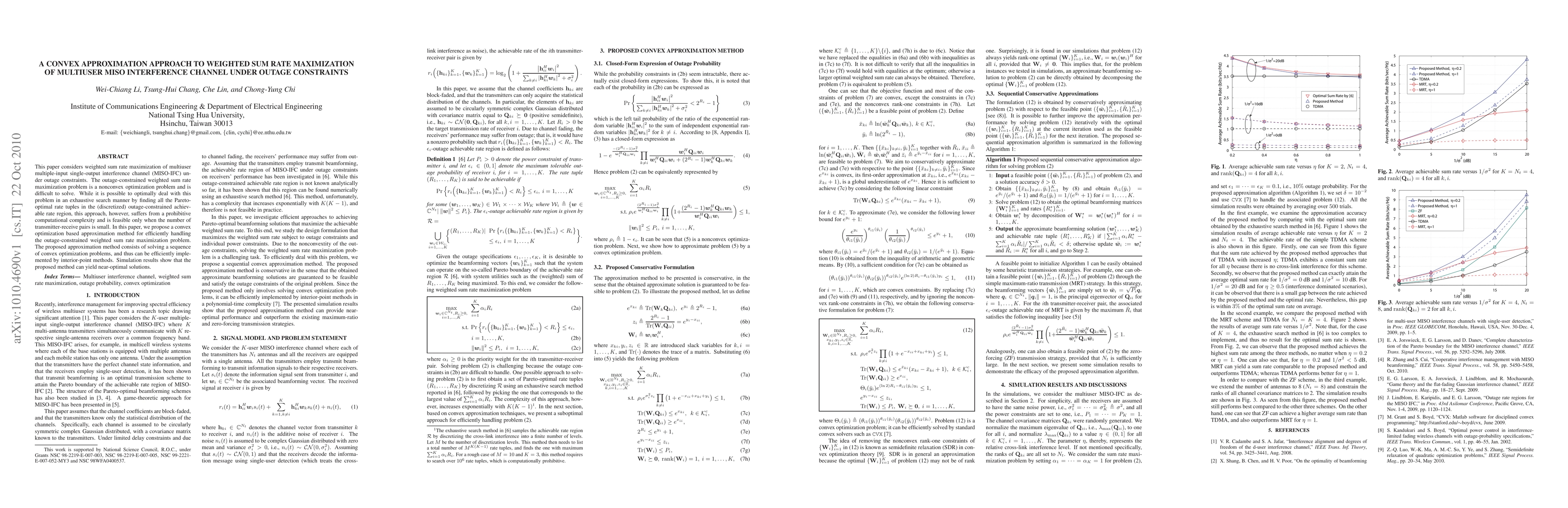 This paper proposes a convex optimization-based approximation method to efficiently solve the nonconvex weighted sum rate maximization problem in multiuser MISO interference channels under outage constraints, achieving near-optimal solutions with significantly reduced computational complexity compared to exhaustive search methods.