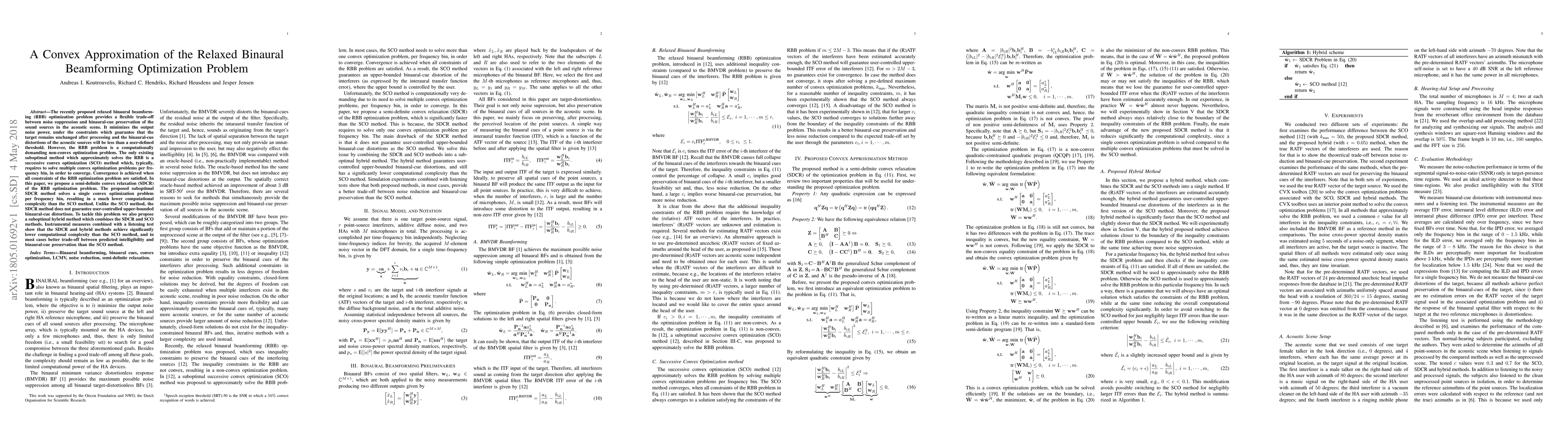 The recently proposed relaxed binaural beamforming (RBB) optimization problem provides a flexible trade-off between noise suppression and binaural-cue preservation of the sound sources in the acoustic scene. It minimizes the output noise power, under the constraints which guarantee that the target remains unchanged after processing and the binaural-cue distortions of the acoustic sources will be less than a user-defined threshold. However, the RBB problem is a computationally demanding non-convex optimization problem. The only existing suboptimal method which approximately solves the RBB is a successive convex optimization (SCO) method which, typically, requires to solve multiple convex optimization problems per frequency bin, in order to converge. Convergence is achieved when all constraints of the RBB optimization problem are satisfied. In this paper, we propose a semi-definite convex relaxation (SDCR) of the RBB optimization problem. The proposed suboptimal SDCR method solves a single convex optimization problem per frequency bin, resulting in a much lower computational complexity than the SCO method. Unlike the SCO method, the SDCR method does not guarantee user-controlled upper-bounded binaural-cue distortions. To tackle this problem we also propose a suboptimal hybrid method which combines the SDCR and SCO methods. Instrumental measures combined with a listening test show that the SDCR and hybrid methods achieve significantly lower computational complexity than the SCO method, and in most cases better trade-off between predicted intelligibility and binaural-cue preservation than the SCO method.