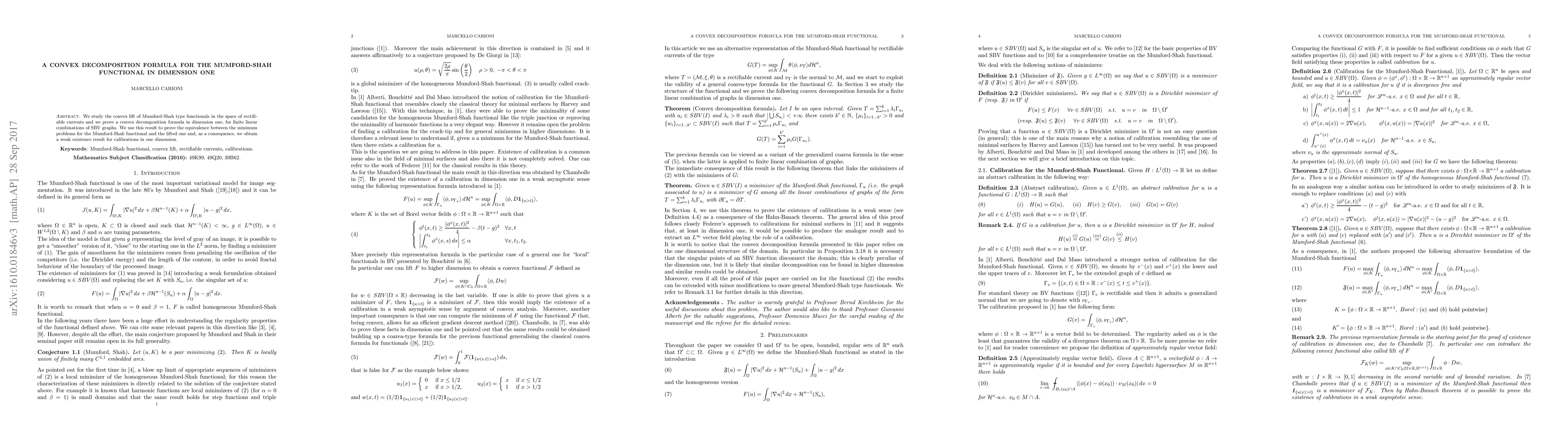 This paper proves a convex decomposition formula for the Mumford-Shah functional in one dimension, establishing a generalized coarea formula for SBV graphs and demonstrating equivalence between the original and lifted functionals, leading to weak existence results for calibrations.