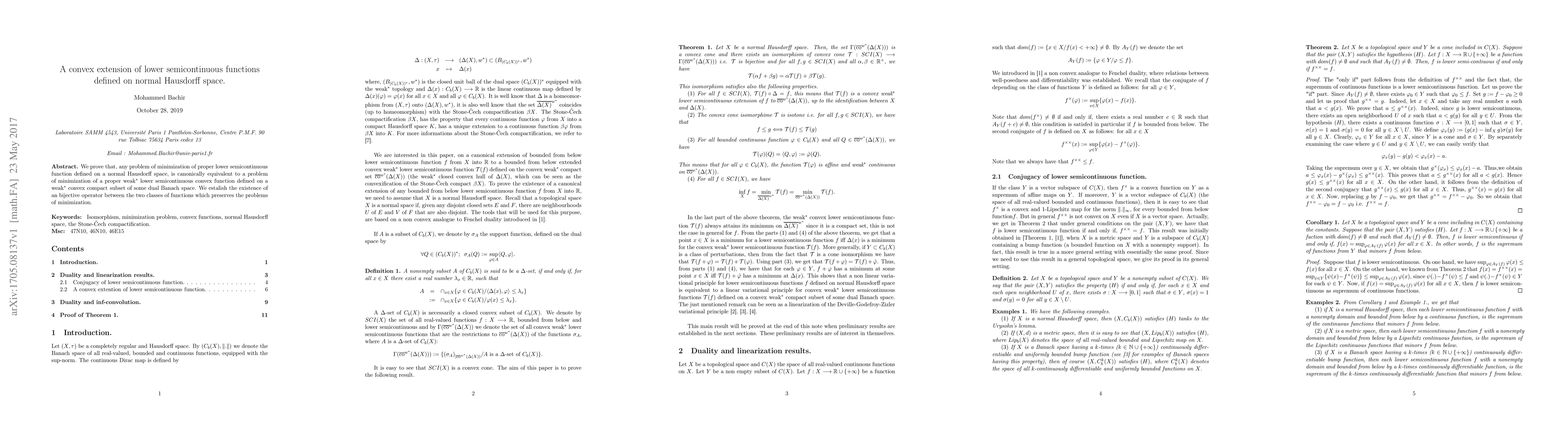 This paper proves the equivalence between minimizing proper lower semicontinuous functions on a normal Hausdorff space and minimizing proper weak * lower semicontinuous convex functions on a weak * convex compact subset of a dual Banach space, establishing a bijective operator that preserves minimization problems.