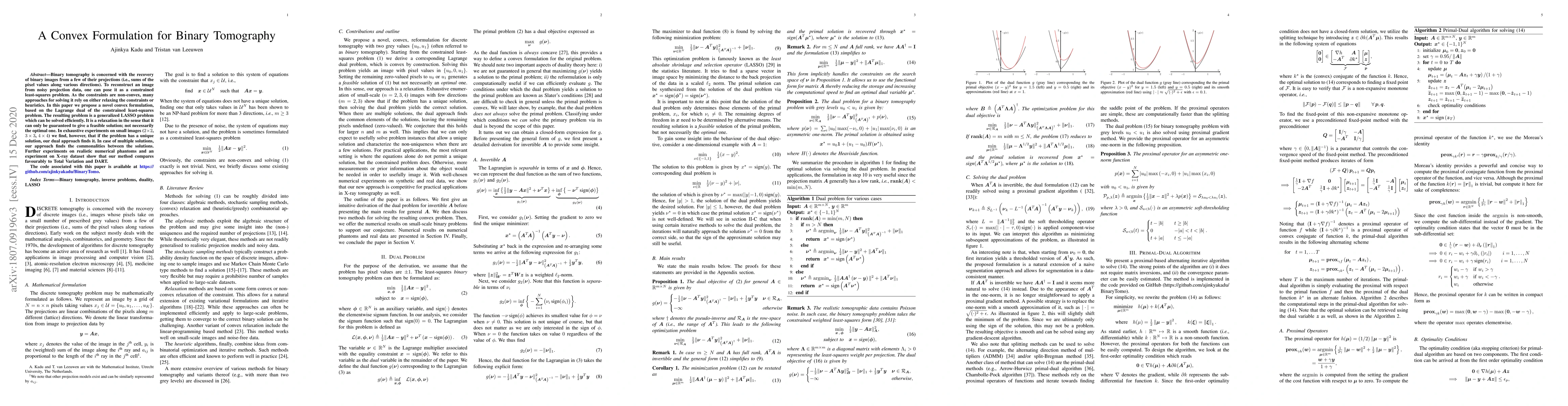 Researchers propose a new method for reconstructing binary images from noisy projections using a convex formulation based on Lagrange dual, achieving efficient solution with favorable performance compared to existing methods.