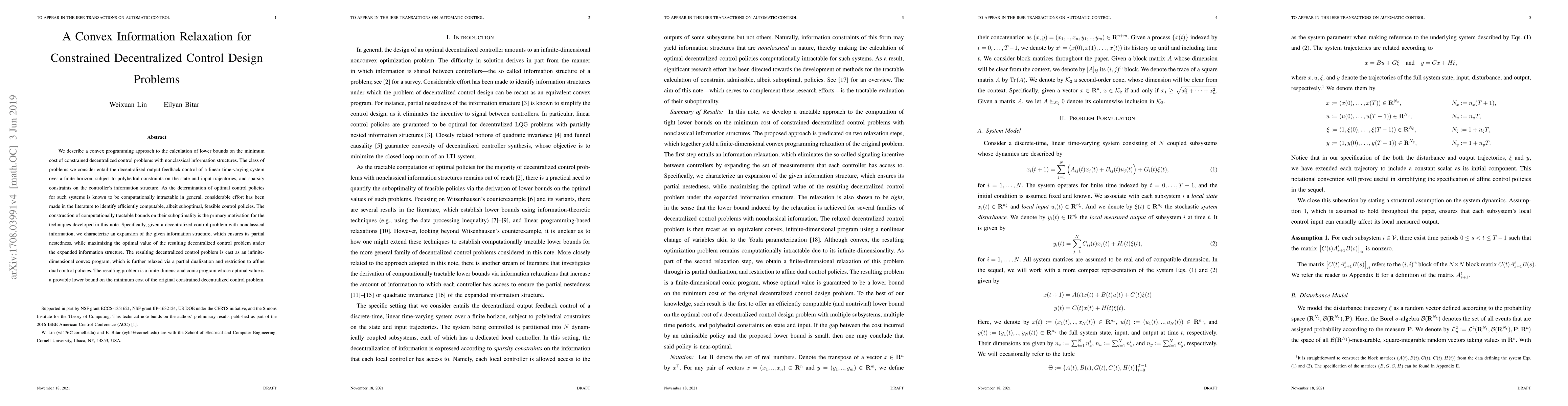 This paper proposes a convex programming method to compute lower bounds for the minimum cost of decentralized control problems with nonclassical information structures, transforming the infinite-dimensional problem into a finite-dimensional conic program, which provides a tractable lower bound on the original problem's cost.