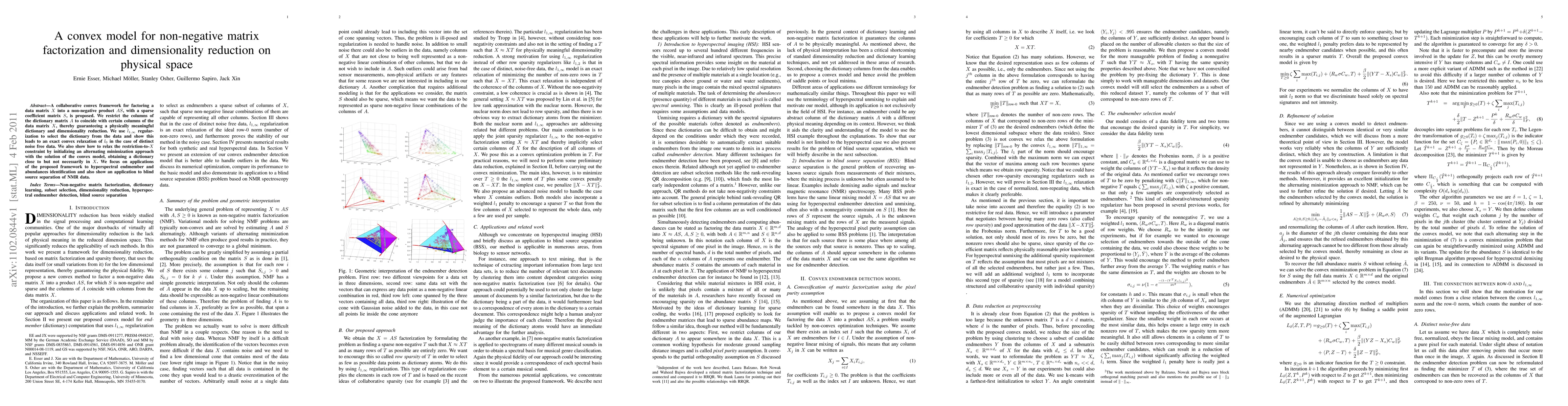 A new collaborative convex framework is proposed for factorizing data into a non-negative product with dimensionality reduction, ensuring physically meaningful dictionaries. The method shows promise for applications in hyperspectral analysis and blind source separation of NMR data.