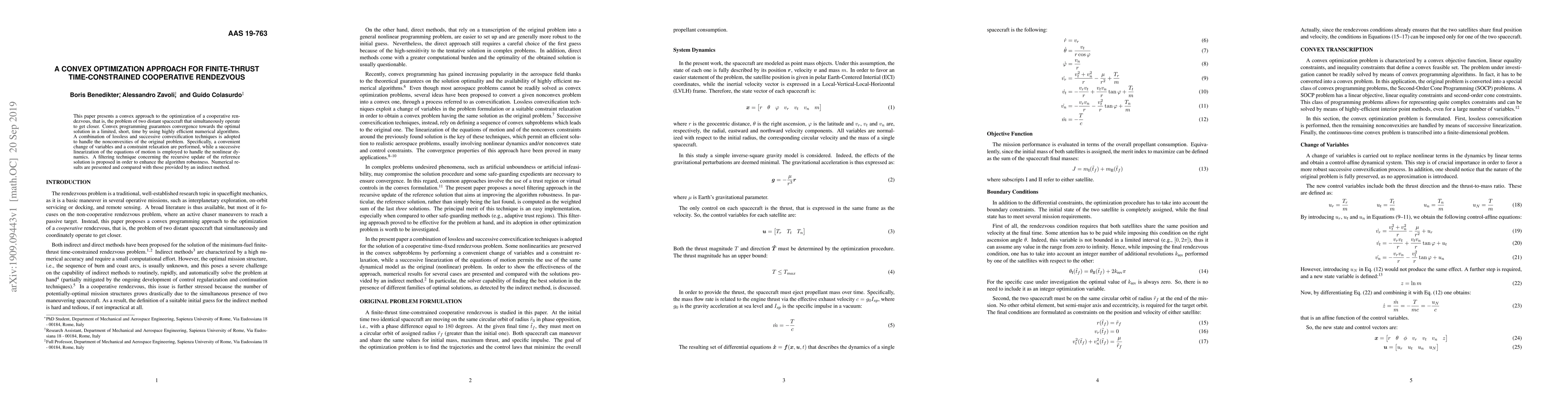 This paper presents a convex optimization approach to solve the cooperative rendezvous problem for two spacecraft that operate simultaneously to get closer, using efficient numerical algorithms and techniques to handle nonconvexities and nonlinear dynamics.