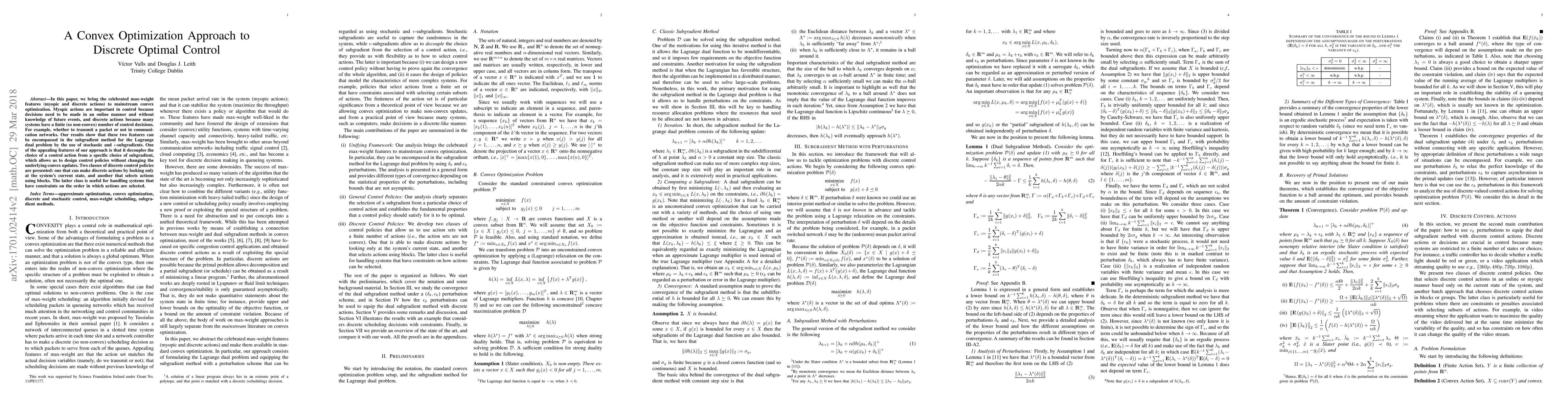 In this paper, we bring the celebrated max-weight features (myopic and discrete actions) to mainstream convex optimization. Myopic actions are important in control because decisions need to be made in an online manner and without knowledge of future events, and discrete actions because many systems have a finite (so non-convex) number of control decisions. For example, whether to transmit a packet or not in communication networks. Our results show that these two features can be encompassed in the subgradient method for the Lagrange dual problem by the use of stochastic and $\epsilon$-subgradients. One of the appealing features of our approach is that it decouples the choice of a control action from a specific choice of subgradient, which allows us to design control policies without changing the underlying convex updates. Two classes of discrete control policies are presented: one that can make discrete actions by looking only at the system's current state, and another that selects actions using blocks. The latter class is useful for handling systems that have constraints on the order in which actions are selected.