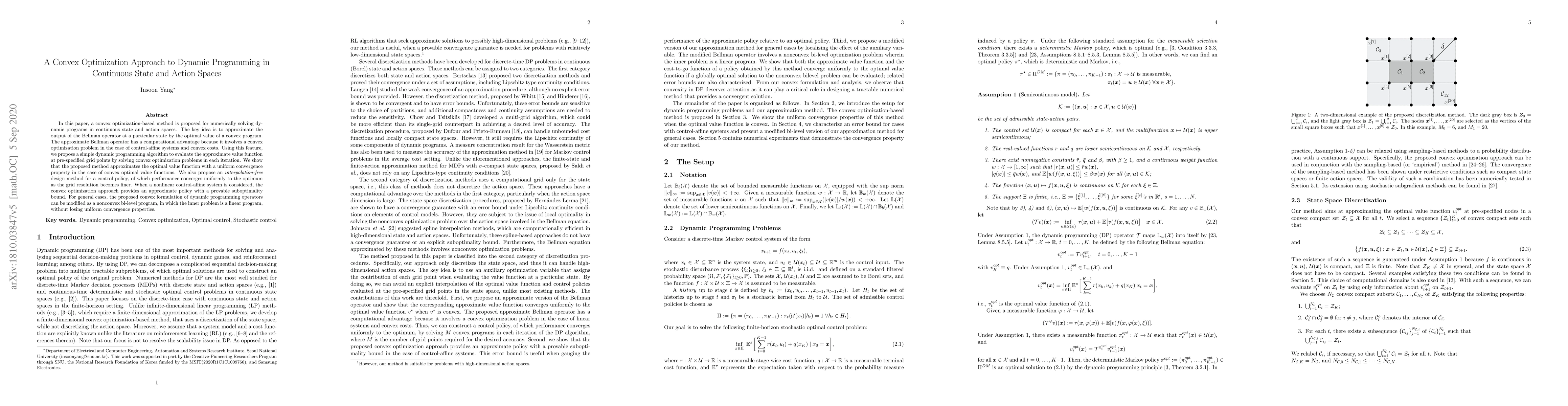 This paper proposes a convex optimization method for solving dynamic programs in continuous state and action spaces, approximating the Bellman operator via convex programs. The method provides a uniform convergence approximation for optimal value functions and a control policy design that converges uniformly as grid resolution increases.