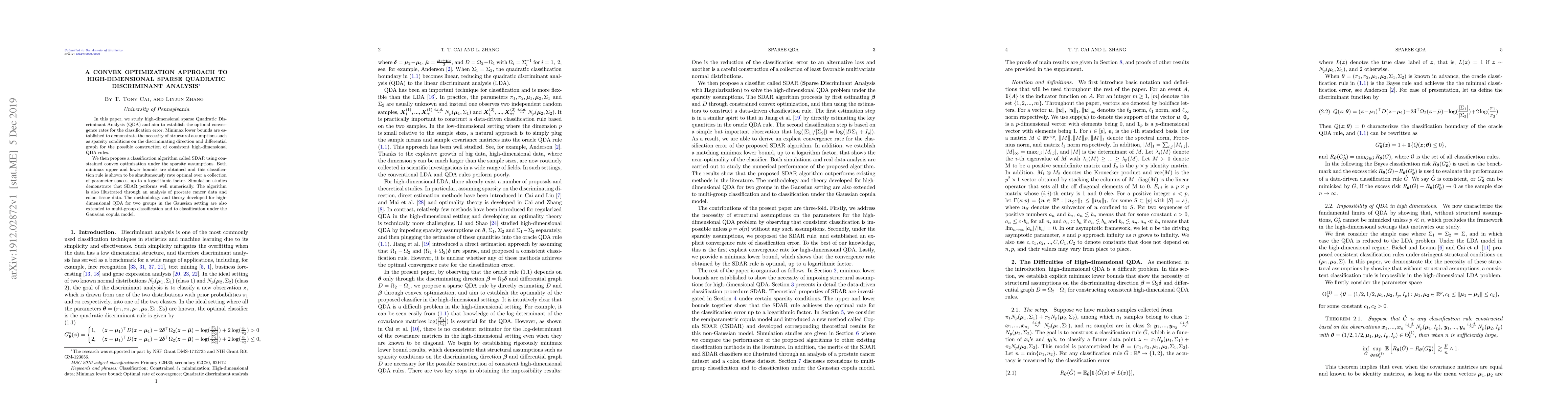 This paper proposes a convex optimization algorithm, SDAR, for high-dimensional sparse Quadratic Discriminant Analysis (QDA) to achieve optimal convergence rates for classification error. Theoretical minimax bounds confirm the algorithm's rate optimality and numerical simulations show its effectiveness in real-world data applications.
