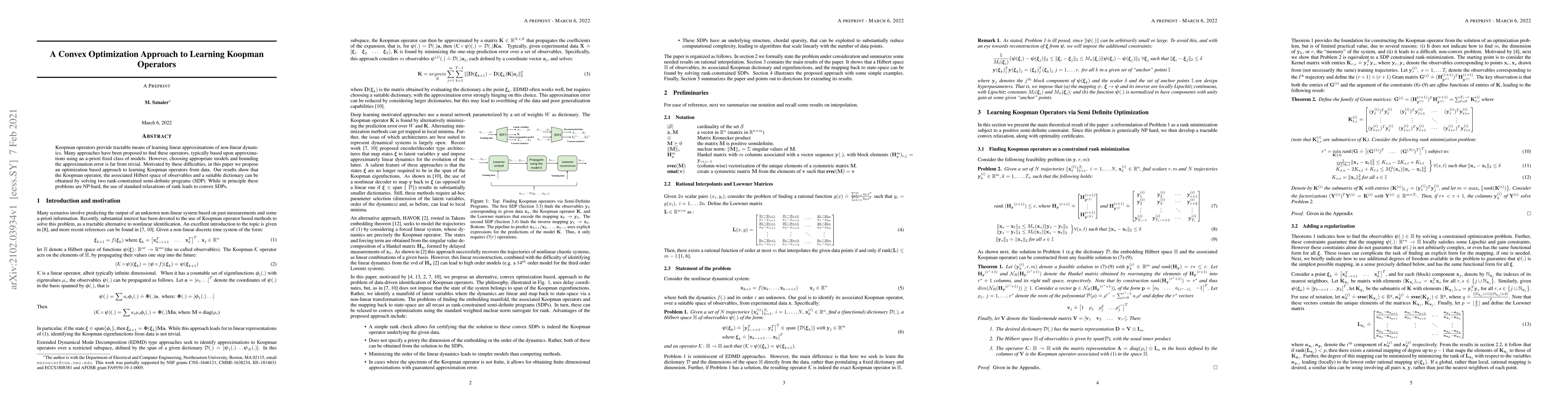 This paper proposes an optimization-based method to learn Koopman operators from data, addressing the challenges of model selection and approximation error. The approach involves solving two convex rank-constrained semi-definite programs, which, despite being NP-hard, are efficiently solved using standard relaxations and exhibit linear scalability with data points.
