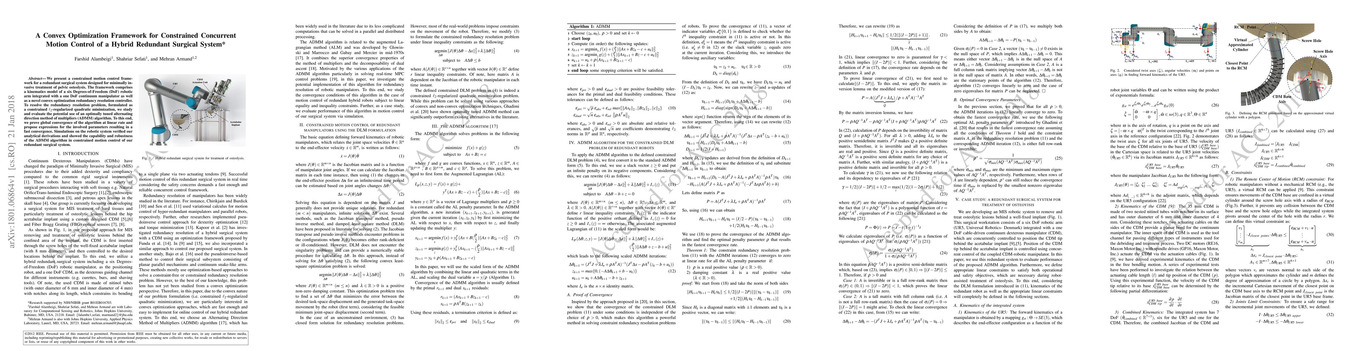 This paper introduces a convex optimization framework for controlling a hybrid redundant surgical system, integrating a six DoF robotic arm and a one DoF continuum manipulator. It employs an optimally tuned ADMM algorithm for redundancy resolution, proving global convergence and demonstrating its effectiveness through simulations.