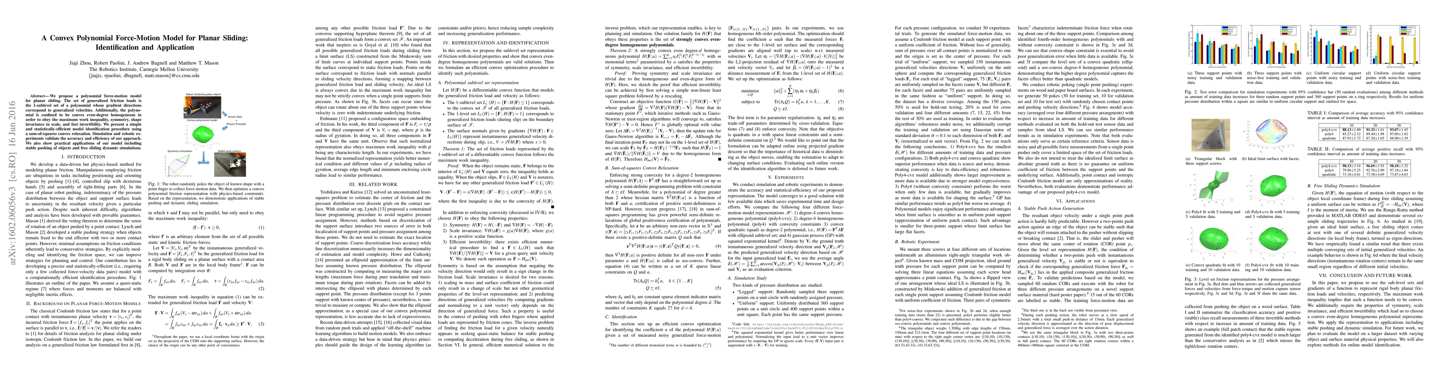 We propose a polynomial force-motion model for planar sliding. The set of generalized friction loads is the 1-sublevel set of a polynomial whose gradient directions correspond to generalized velocities. Additionally, the polynomial is confined to be convex even-degree homogeneous in order to obey the maximum work inequality, symmetry, shape invariance in scale, and fast invertibility. We present a simple and statistically-efficient model identification procedure using a sum-of-squares convex relaxation. Simulation and robotic experiments validate the accuracy and efficiency of our approach. We also show practical applications of our model including stable pushing of objects and free sliding dynamic simulations.