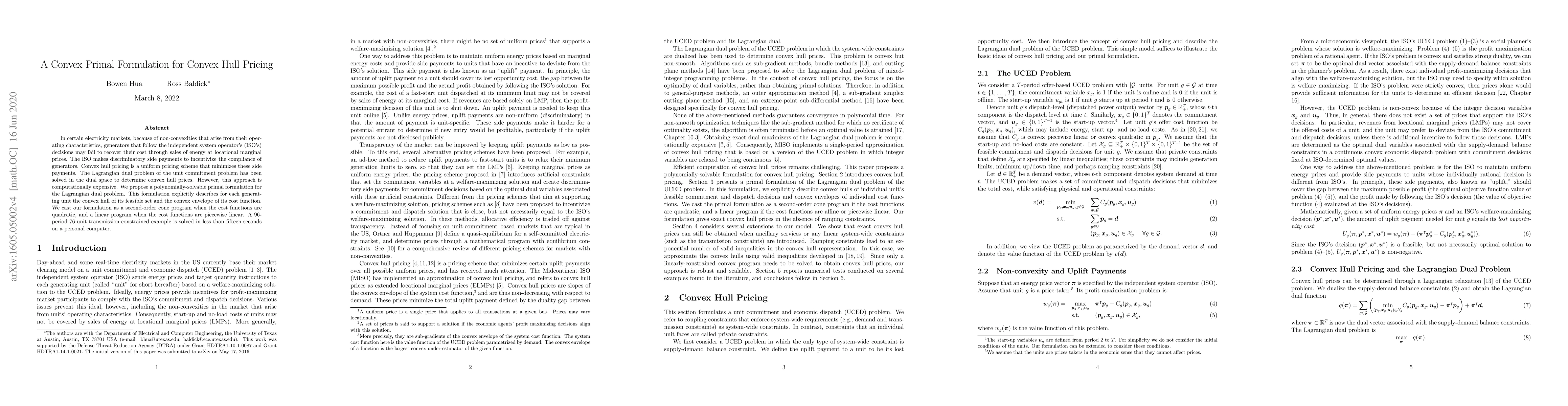 This paper proposes a polynomially-solvable convex primal formulation for determining convex hull prices in electricity markets, offering an efficient alternative to the computationally expensive Lagrangian dual approach. The proposed method is a second-order cone program for quadratic cost functions and a linear program for piecewise linear ones.